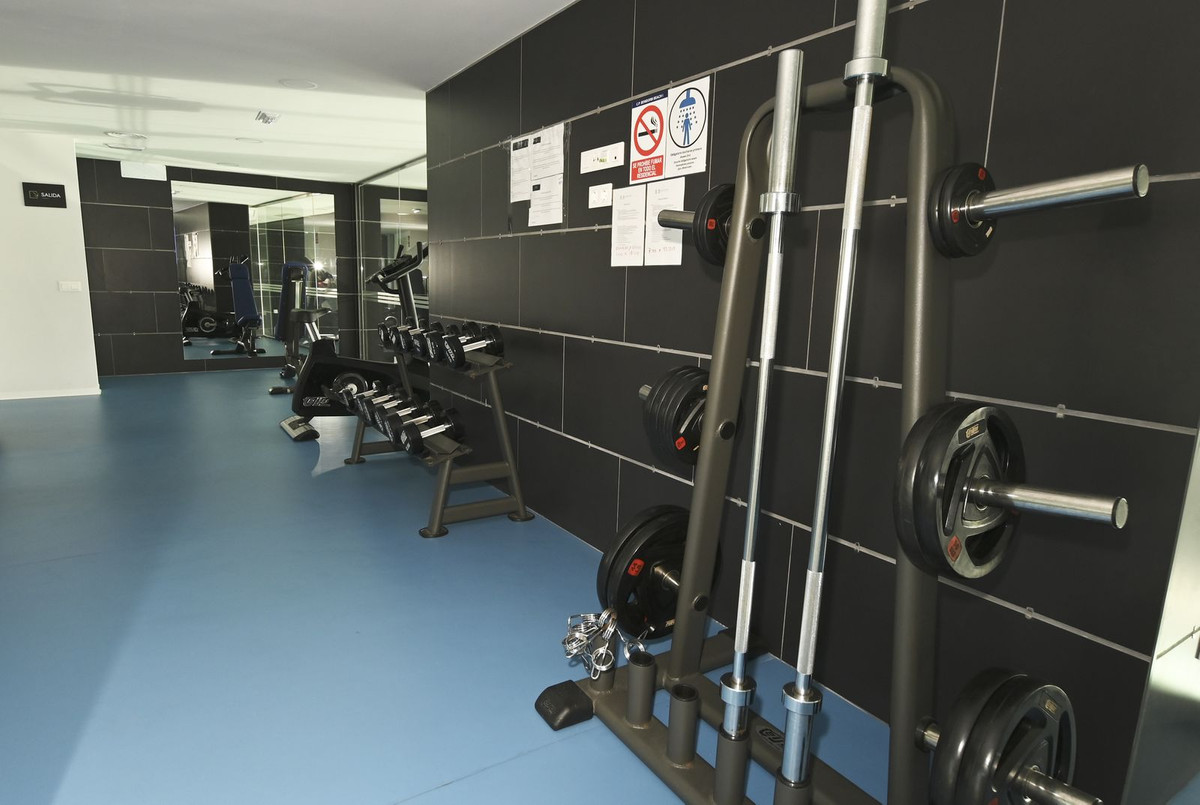 Heated swimming pool and a modern gym with panoramic sea views on the 26th floor of the block.