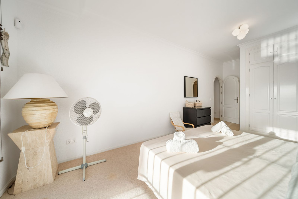 Outside, the property showcases a large frontage surrounded by greenery with a stone fountain as a centre piece, a private swimming pool with capacity of 48 m3 with an adjacent washroom / toilet, a large double garage and additional parking on the drive. There is also a large store room. With a plot size of 1,000 m² and 300 m² of constructed area, this villa is a rare find in the area. Built in 1986 and maintained in good condition, it includes fitted wardrobes, a storeroom, and modern heating and air conditioning throughout. Don't miss this opportunity to own a piece of paradise with unparalleled golf and sea views.