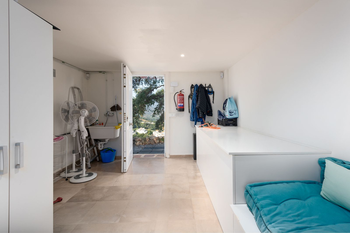 The villa spans two levels, plus a large basement and an attic with potential for an additional bedroom or office space. Upon entering through an elegant conservatory patio, you are welcomed by an impressive solid oak wood Arabic-style door. The spacious and cozy living room with a fireplace flows into a large dining area, while the brand-new, fully equipped luxury kitchen opens onto a charming courtyard, perfect for breakfast. Adjacent to the kitchen is a large laundry and storage room. The rear terrace offers breathtaking panorama to the mountains and lush country side.