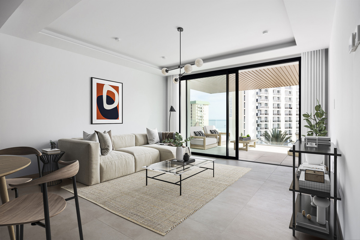 Introducing an unparalleled opportunity to own a brand new, never-before-lived-in apartment a few meters from the beach. This luxurious residence boasts a spacious open floor plan, adorned with high-quality materials and fresh, bright colors that create a vibrant and welcoming atmosphere. The east-facing apartment is bathed in natural light, thanks to the expansive windows and sliding doors that seamlessly connect to a wrap-around terrace, offering stunning sea and mountain views and an ideal space for relaxation and entertainment.