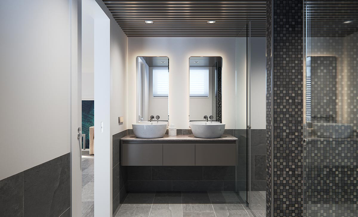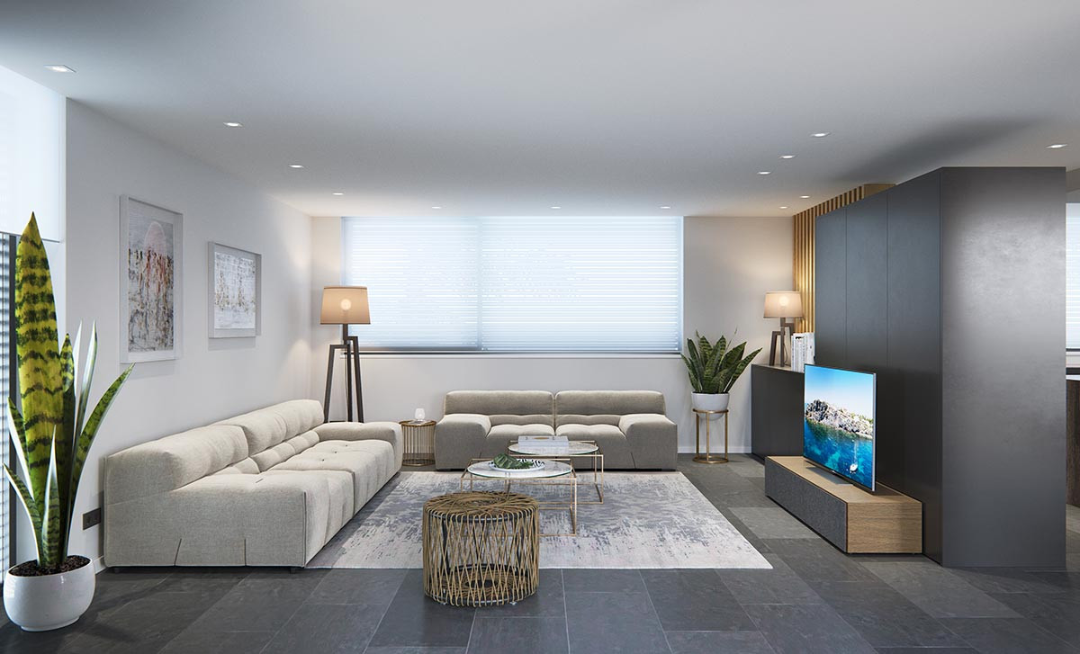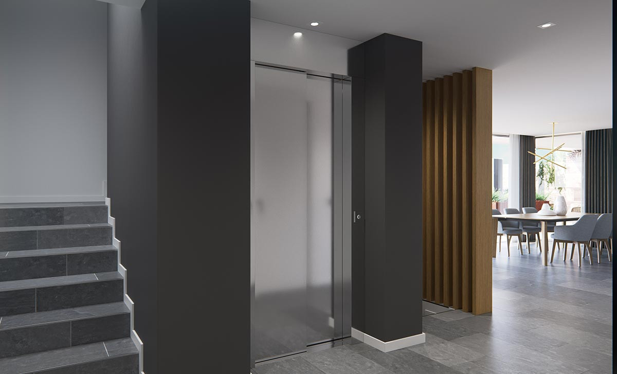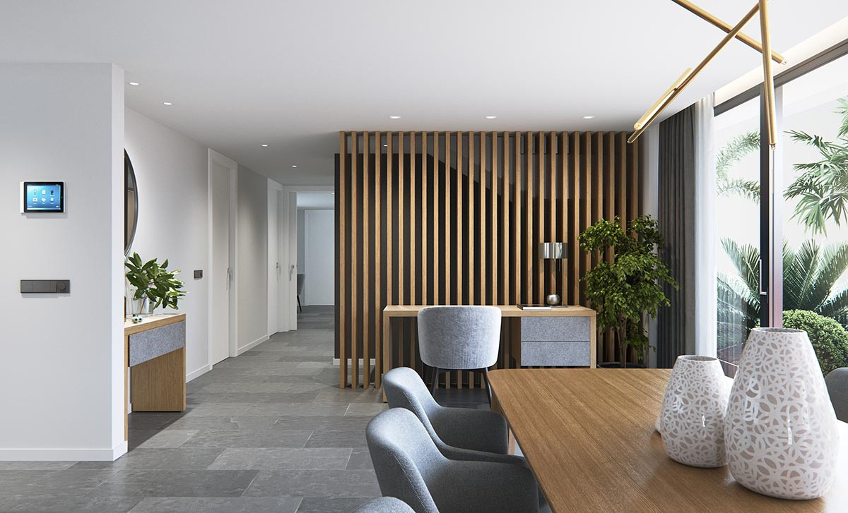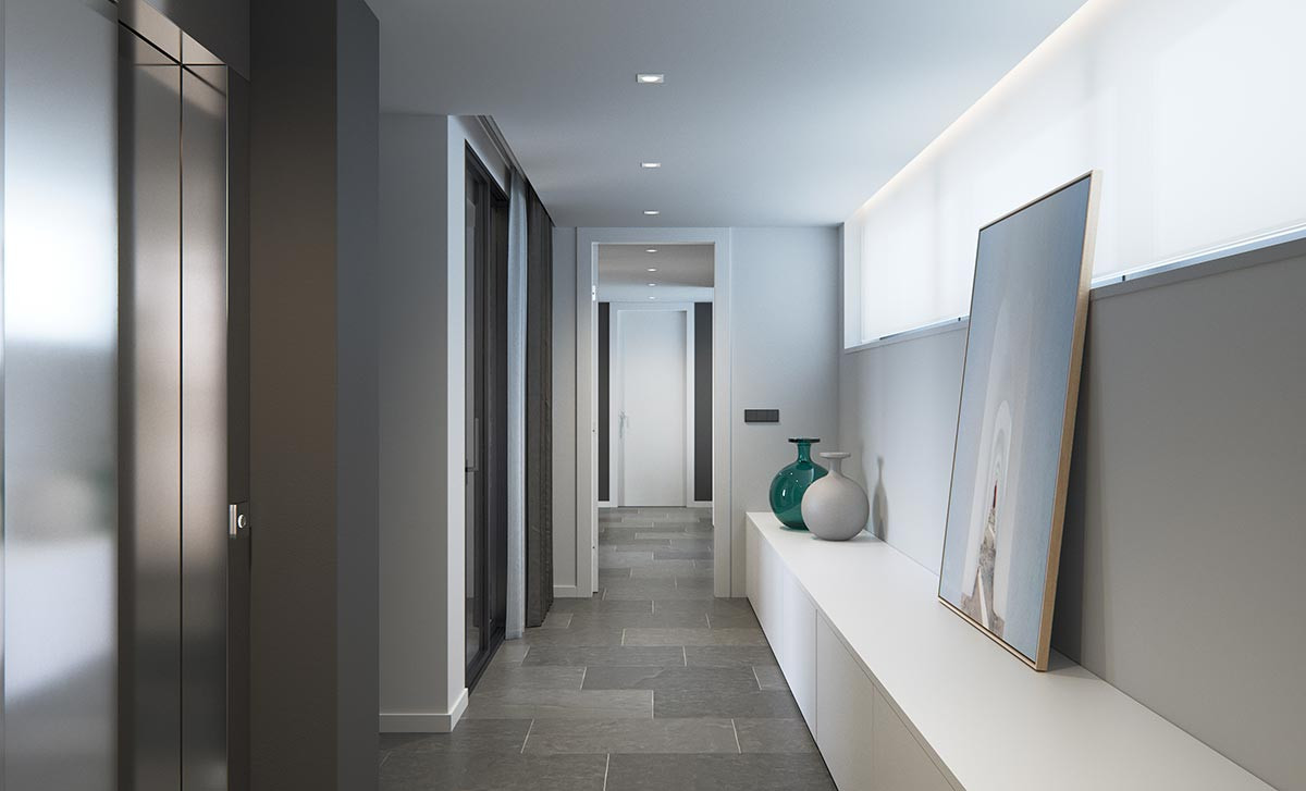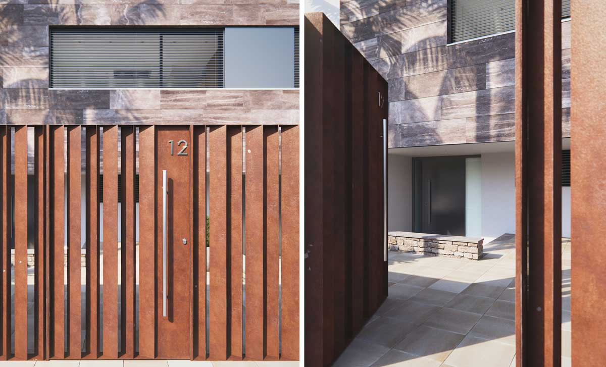 Garden and garage access doors automated with infrared remote controls. Garage for two vehicles and parking slot for an additional one.