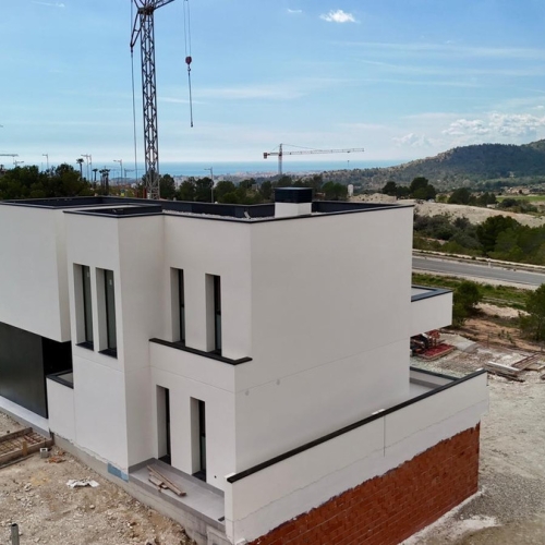 Discover this stunning villa located in the coveted sector 13 of Finestrat, just 4000 meters from the beach. With an ideal total built area designed for enjoying comfort and modern style, this new property features three spacious double bedrooms and two fully equipped bathrooms. The kitchen is made for food lovers and offers everything needed to delight in cooking.The villa faces south, allowing natural light to flood all its spaces thanks to elegant porcelain stoneware flooring. This home is not only bright but also functional; it includes PMR adapted access, central air conditioning (cool/heat), and alarm installation for additional security.Outside you will find your own private garden adorned with lush trees as well as a pool where you can relax on sunny days under a cozy pergola. Additionally, there's an exclusive patio perfect for family or social gatherings with friends.Additional amenities include strategically designed fitted wardrobes maximizing storage without sacrificing usable space; independent laundry room; armored door ensuring maximum privacy; video intercom providing greater control over accesses;personalized pergolas within the outdoor area protected by automatic doors facilitating quick entry/exit from included parking - all complemented by automatic irrigation ensuring easy maintenance while enjoying every corner both indoors and outdoors!Located near various services such as nearby shopping centers (supermarkets), key local hospitals necessary for urgent medical attention plus schools/educational centers right around gated community creating perfectly safe environment young families seeking grow together . Without question this could be your future dream residence! The sea views are simply breathtaking.