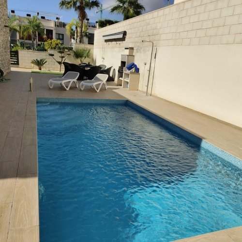 This spacious villa of 480 m² is situated on a 564 m² plot and consists of 3 floors and a solarium. The property features a garden and several terraces to enjoy the outdoors.Upon entering the house, you are welcomed into a hallway. To the left is the independent kitchen with a dining area and access to a covered terrace. In front of you are the living room, a bedroom, and a bathroom.On the second floor, accessed by stairs, there are 4 additional bedrooms, one of which has an en-suite bathroom. All bedrooms have access to a terrace.On the third level, there is a solarium with panoramic views.In the basement, there is an independent apartment with 3 bedrooms, a full bathroom, a living room, and a kitchen. There is also a large room that can be used as a games area, along with a summer kitchen and an additional bathroom.Equipment:The villa is equipped with a security door, double-glazed windows, a fully equipped kitchen, air conditioning (cold/heat), a kidney-shaped pool, covered and open terraces, a garden, a solarium, and an independent apartment. It also has a games area and a summer kitchen.Location:The villa is located in the residential area of Rincón de Loix in Benidorm, close to the main avenue with bus stops, taxis, camping, the private Lope de Vega school, supermarkets, and other amenities. Alicante-El Altet Airport and the port of Alicante are a 45-minute drive away, and the La Marina shopping center, with numerous shops and large supermarkets, is just 15 minutes away.