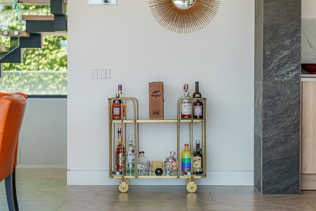 Ascending to the main floor, you will find a designer open-plan kitchen equipped with top-of-the-line Gaggenau appliances. The living room extends onto an outdoor terrace, creating an idyllic indoor and outdoor living experience. Here, you can enjoy a refreshing swim in the pool, prepare meals in the outdoor kitchen, or relax in the chill-out area next to the fireplace.