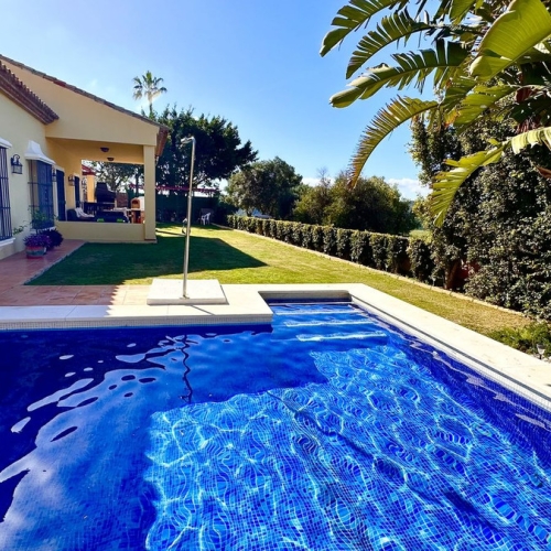 Fully renovated luxury villa on a large private plot with views of the green area in an established and desirable residential area, La Duquesa. This single-story villa has 4 generously sized bedrooms, all with private bathrooms. Spacious open plan living room, brand new high-quality contemporary kitchen with top-of-the-range appliances. The heart of the home centers around a large fireplace and a living area with magnificent sea views. The private pool and terraces are south-facing, enjoy expansive sea and mountain views and are ideal for families and outdoor living. Unique features are the large flat garden ideal for developing or an incredible children's area. Hilltop location overlooking the green zone park to provide tranquility and views. The demanding high-specification finish ensures buyers can simply move in and enjoy life. Solar panels provide heating and hot water, ensuring low energy costs throughout the year. Large windows allow incredible views and a wonderful harmony from the property to the private gardens.