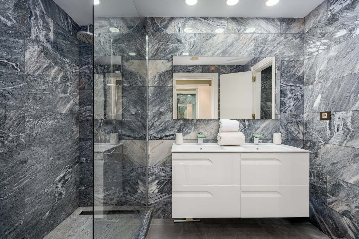 Det finns totalt tre sovrum, alla med garderober. Två sovrum har eget badrum och det finns ytterligare ett familjebadrum för det tredje sovrummet.