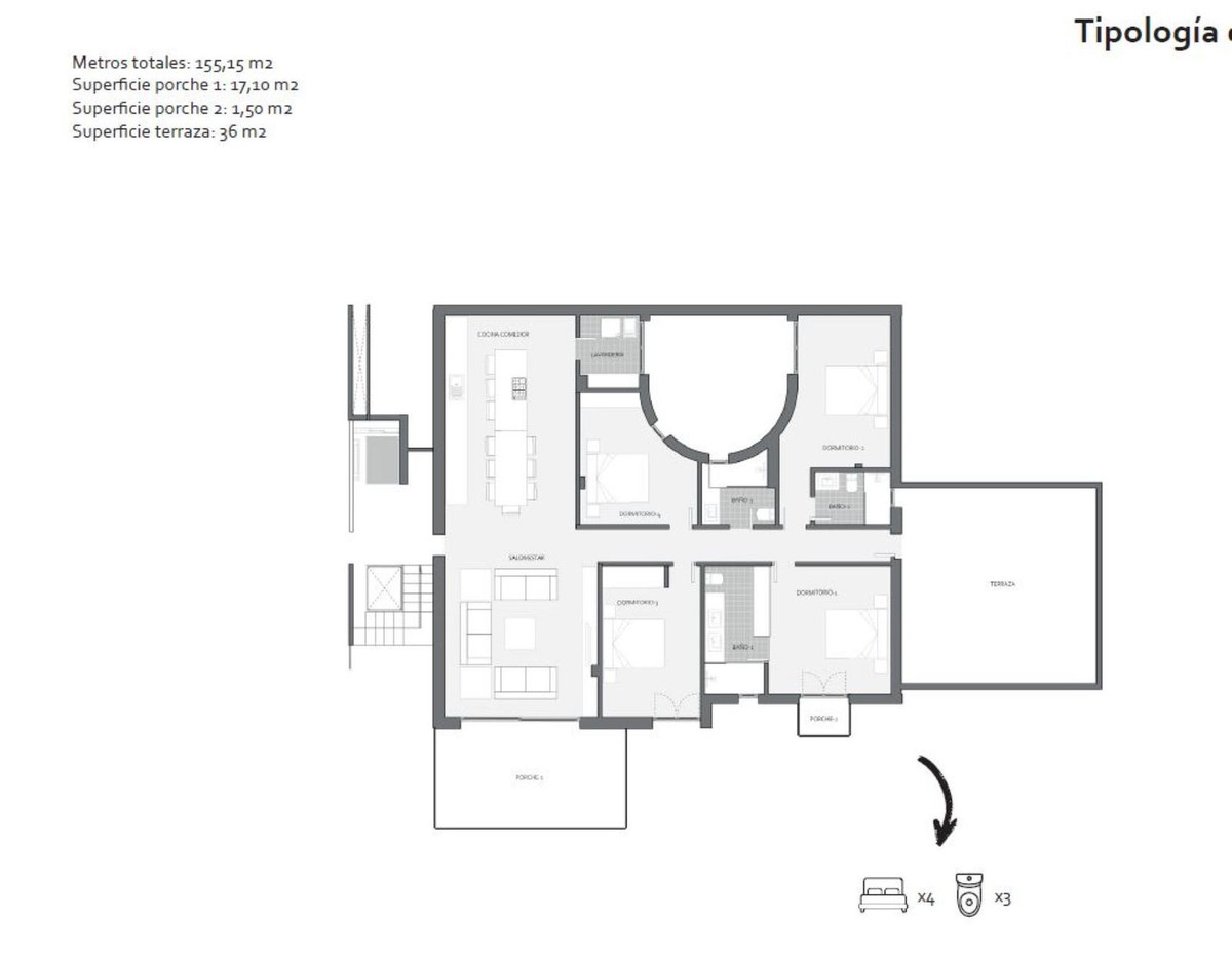 Beautiful brand new 2nd floor apartment with 4 bedrooms and 3 bathrooms of 155.15 m2 with a 36 m2 terrace and two porches, one of 17.10 m2 and the other of 1.50 m2, a parking space included, first quality communal pool, Heating