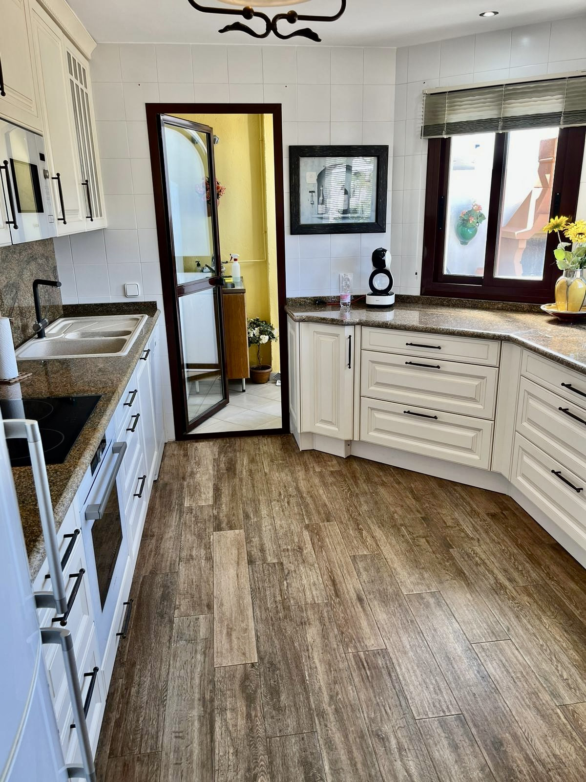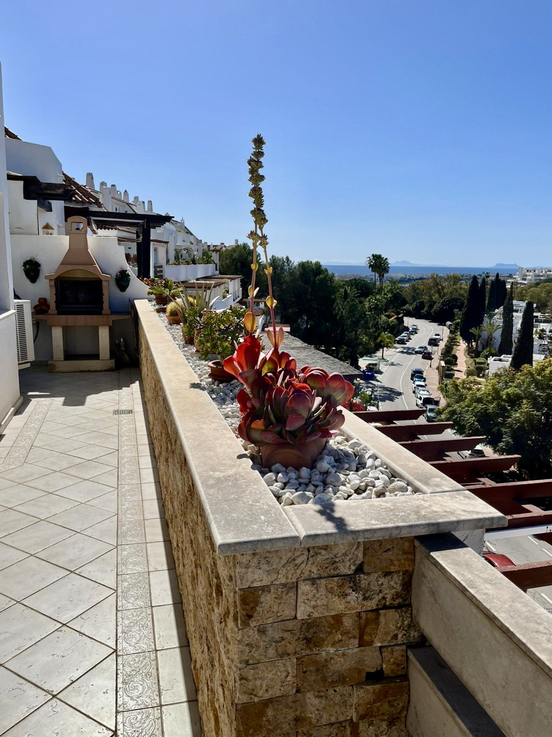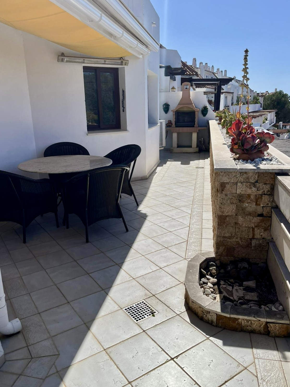 The interior of the penthouse is thoughtfully designed to maximise both functionality and style. Air conditioning and a charming fireplace ensure year-round comfort, while the inclusion of a guest toilet adds an extra layer of practicality. The bedrooms are equipped with fitted wardrobes, offering ample storage space, and the property's layout is enhanced by a solarium and multiple terraces, both covered and uncovered, that provide seamless indoor-outdoor living. The addition of a balcony further accentuates the property's appeal, offering a private space to enjoy the surrounding vistas.