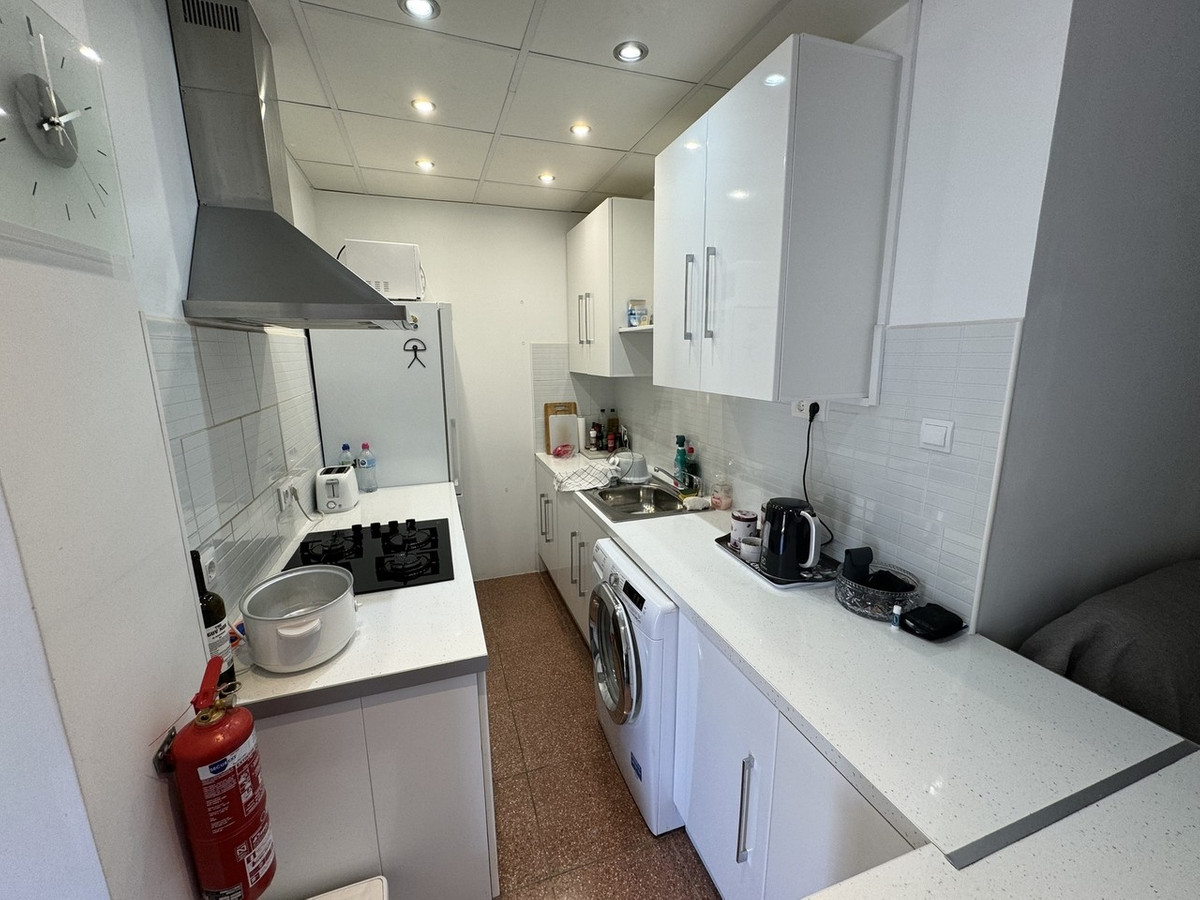 A 1 bedroom, 1 bathroom apartment with a modern white gloss kitchen and open plan living and dining room.