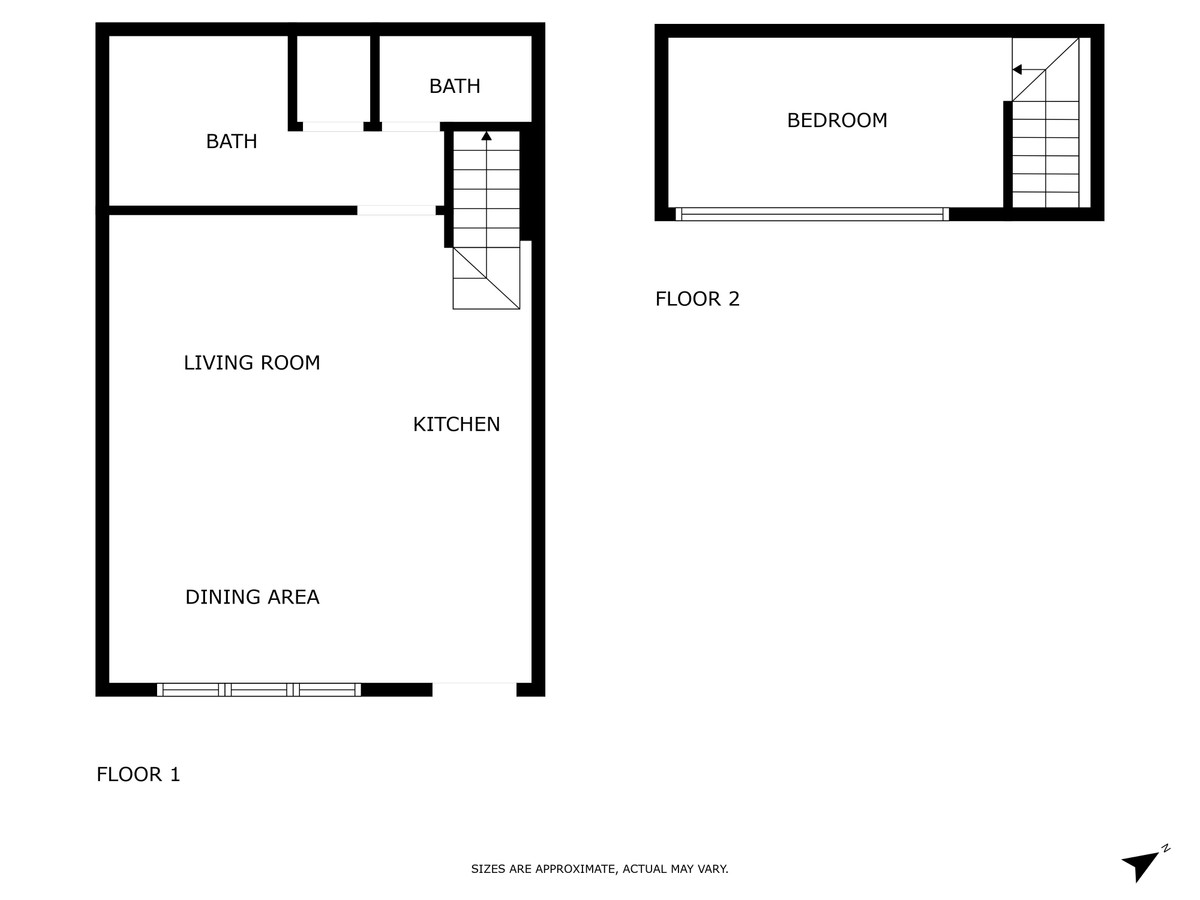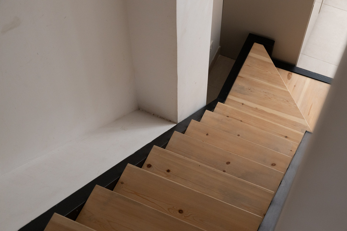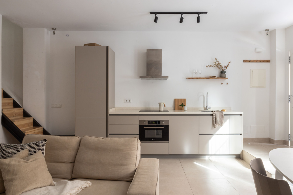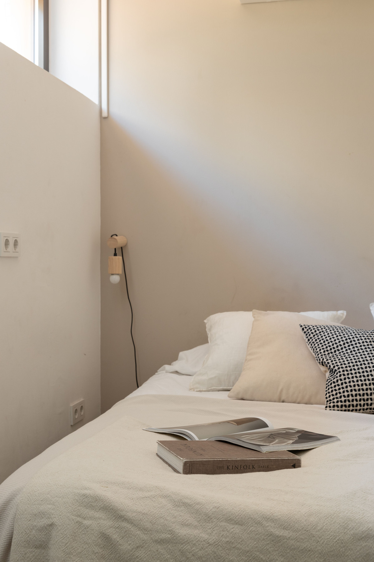 The upper level features a charming bedroom with soft carpeting and small windows, creating a warm and cozy atmosphere. Despite its central location, the apartment offers a peaceful retreat thanks to its quiet positioning.
