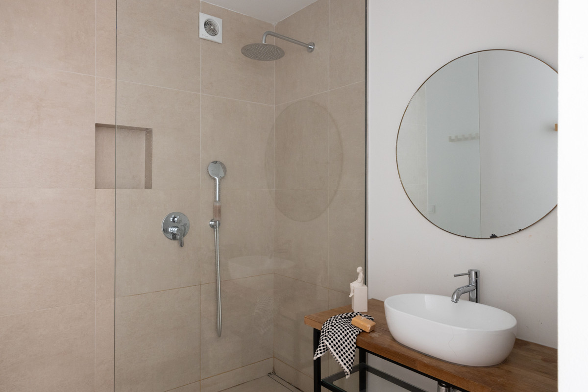 Boasting high ceilings and large windows, the apartment feels spacious and filled with natural light. Upon entering, you're welcomed by a modern and open-plan living space that includes a stylish kitchen, dining area, and a cozy relaxation corner with a sofa and TV. From the living area, you'll find access to a separate toilet, a shower room, and a laundry room for added convenience.