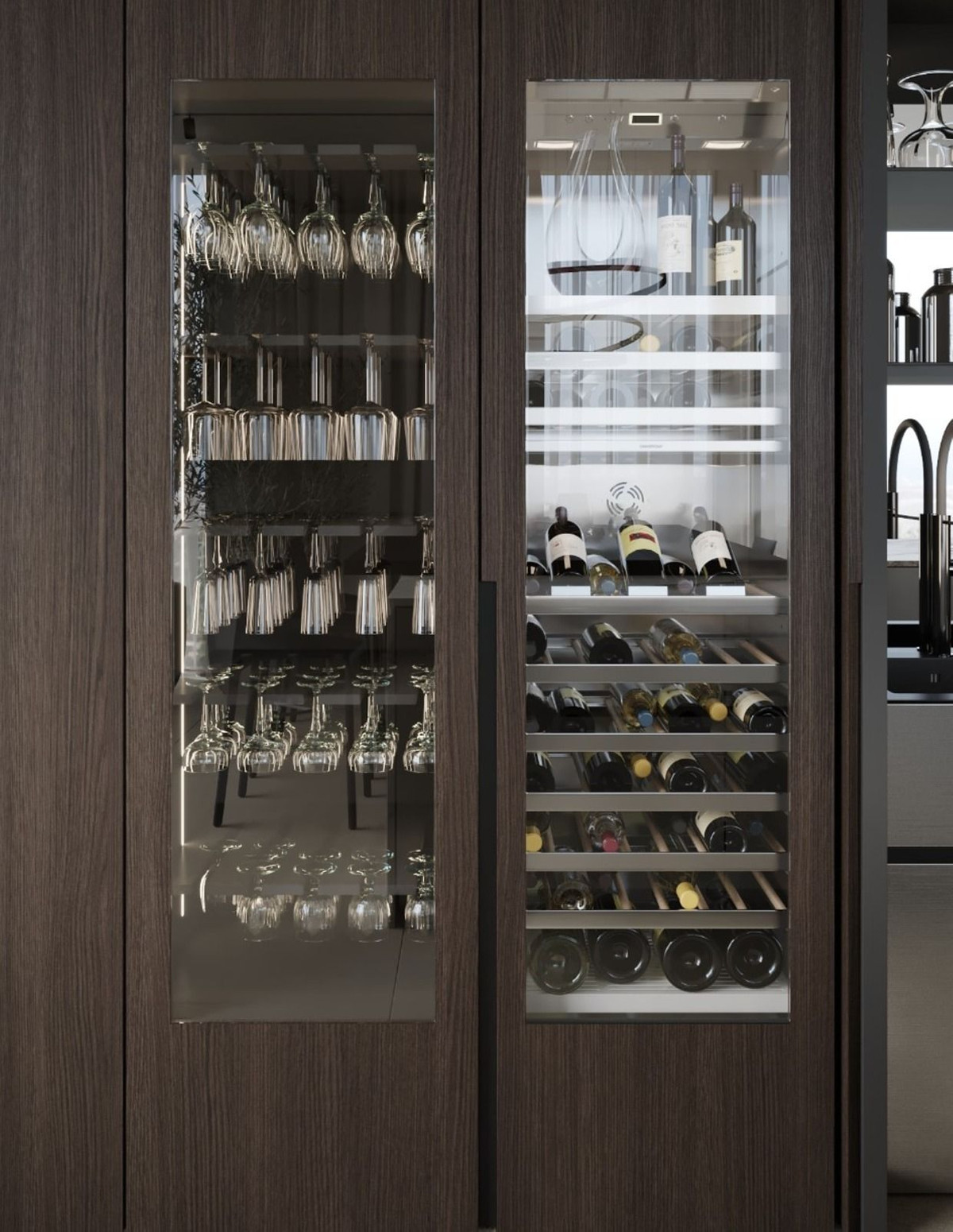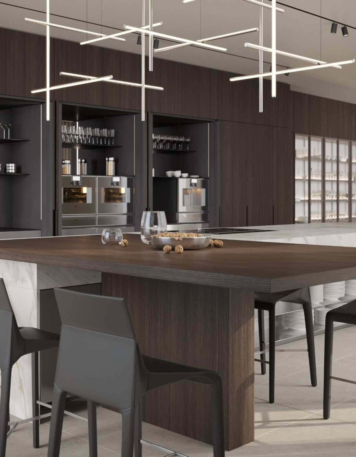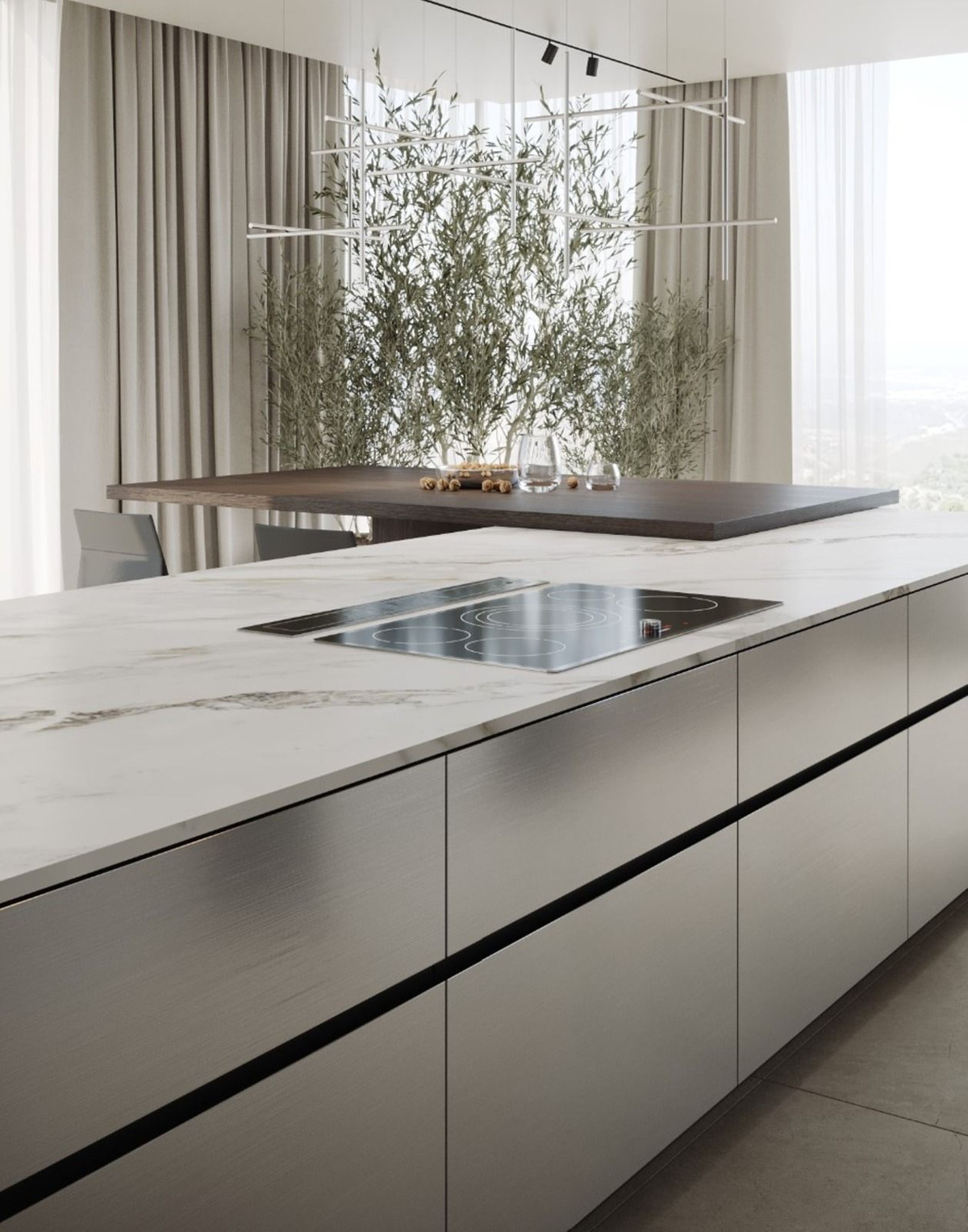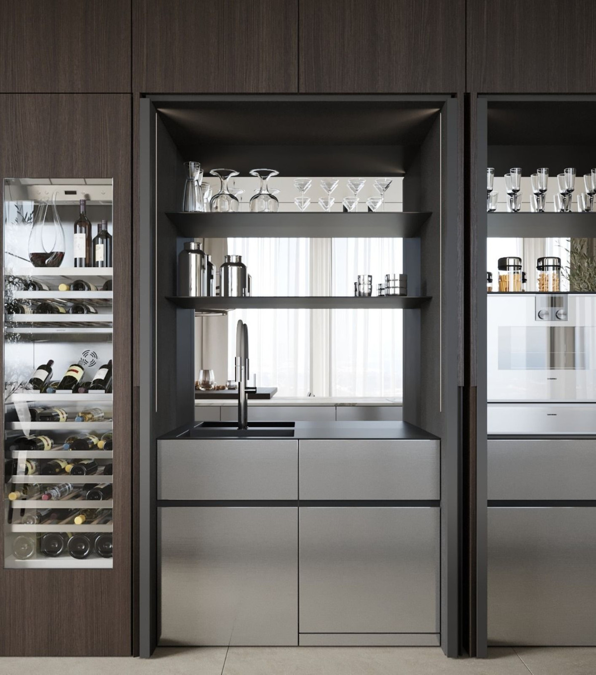 Den lägre nivån är avsedd för wellness och underhållning med gym, bastu, hamam, biorum och inomhuspool. En privat personalvåning med separat ingång ger extra bekvämlighet, medan en hiss förbinder alla nivåer i villan.