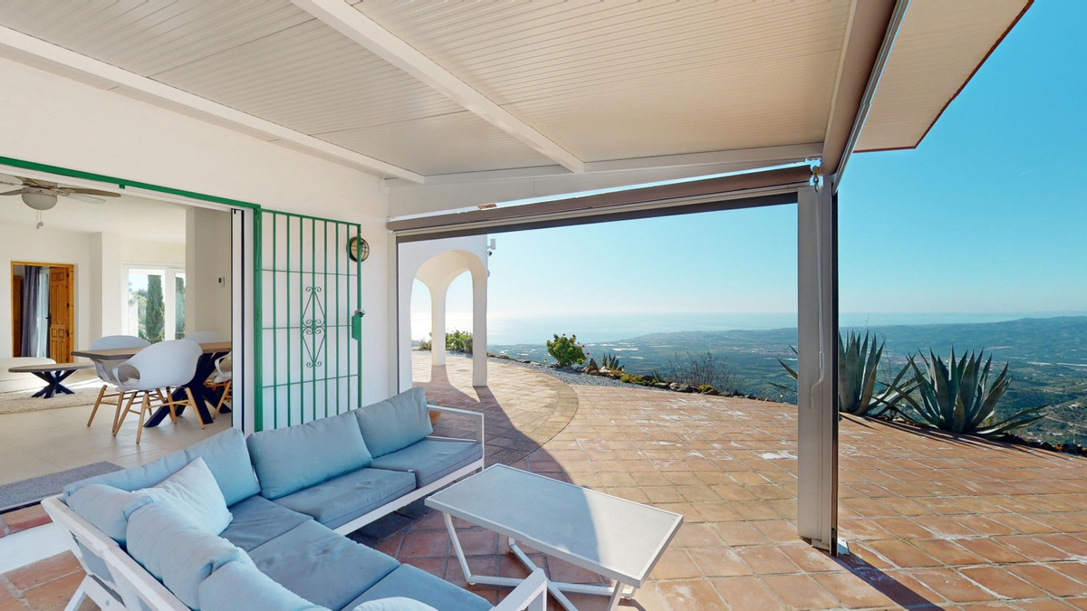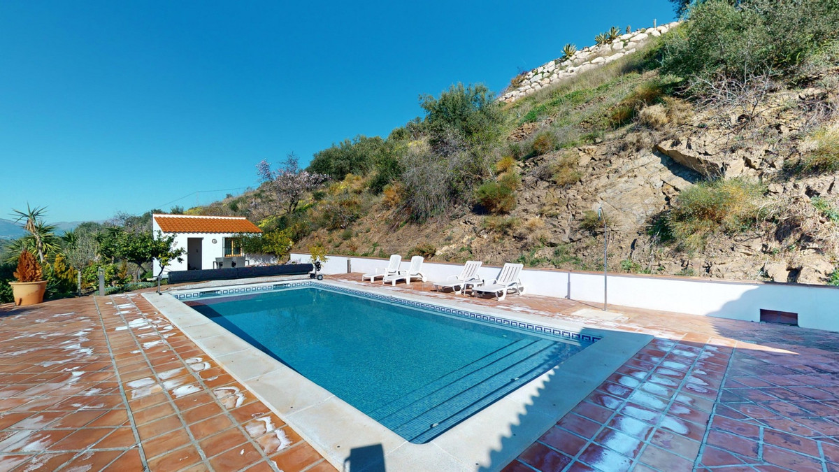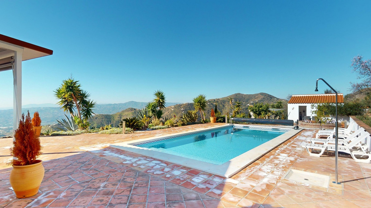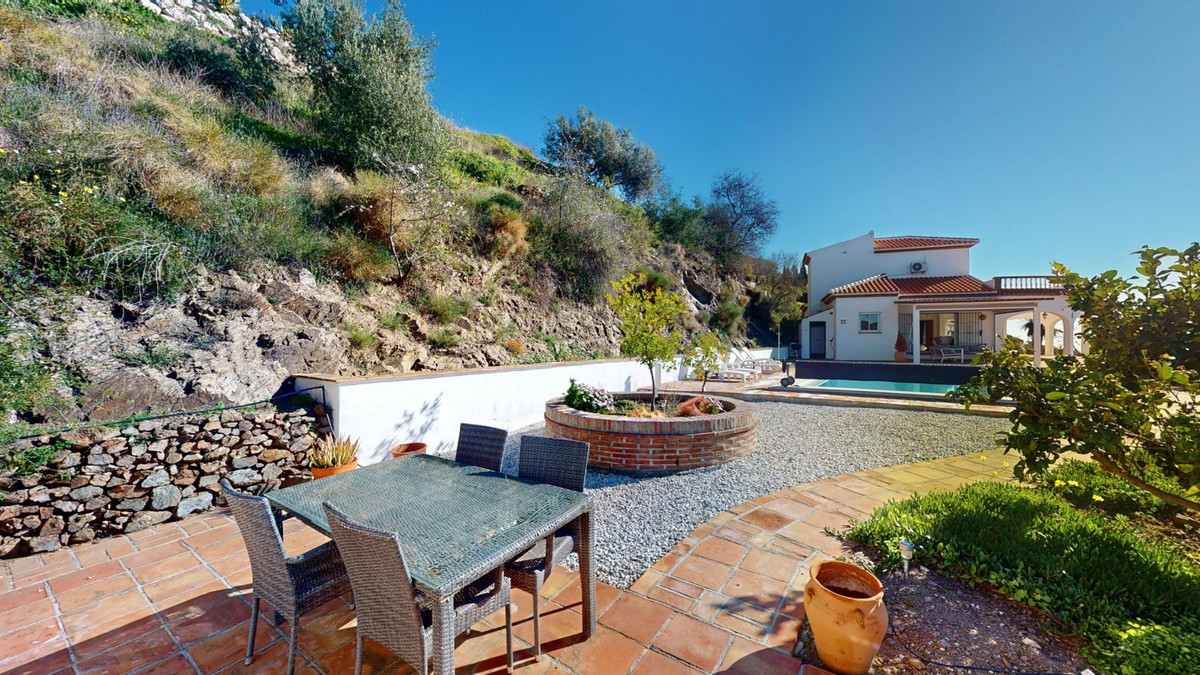 This recently renovated villa is located in a spectacular spot on Bentomiz Mountain in Arenas, just 5 minutes from the charming whitewashed village of Arenas, 20 minutes from the beaches of Algarrobo Costa, and 50 minutes from Málaga Airport, offering the perfect balance between tranquility and accessibility.   The property stands out for its brightness, modern design, and high-quality finishes, featuring a spacious open-plan living room, dining area, and a fully equipped modern kitchen with top-tier appliances, including a gas cooktop, oven, dishwasher, and integrated fridge-freezer. The dining area opens onto a covered terrace, perfect for relaxing or enjoying outdoor meals.   The villa boasts 3 bedrooms and 3 bathrooms, two of which are en-suite. On the ground floor, there is one bedroom with an en-suite bathroom featuring a shower, toilet, and sink, as well as air conditioning, and a second bedroom with a separate bathroom that includes a bathtub, shower, toilet, and sink. The master bedroom, located on the upper floor, features air conditioning, an en-suite bathroom with a shower, toilet, and sink, a walk-in closet, and direct access to a rooftop terrace offering breathtaking panoramic views and unforgettable sunsets. All bedrooms and the living room are equipped with ceiling fans for added comfort during the summer months.   The outdoor area includes an automated saltwater heated pool measuring 9.5 meters by 5 meters and an automatic irrigation system to keep the garden in pristine condition. The property also has a shared well and a water storage tank with a 12,000-liter capacity. Several terraces with shaded areas enhance the outdoor space, one of which can be enclosed with a retractable awning.   The villa is equipped with state-of-the-art technology, including 8 solar panels with a 6 kW inverter, central heating, hot water via a gas boiler, double-glazed windows and doors with anti-theft protection, a comprehensive security system with 24/7 monitoring, and a smart home system that controls lighting, the heat pump, solar panels, and water tank levels.   This property seamlessly blends comfort, style, and sustainability in a privileged setting. Contact us today for more information or to schedule a viewing, either in person or virtually.