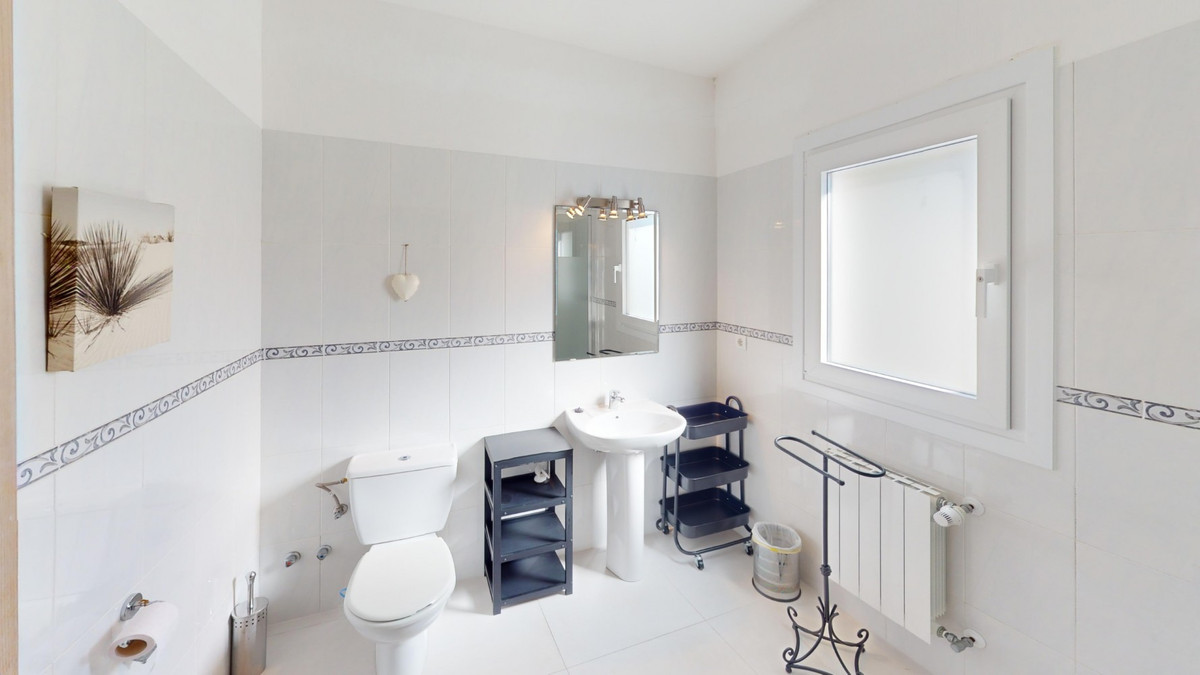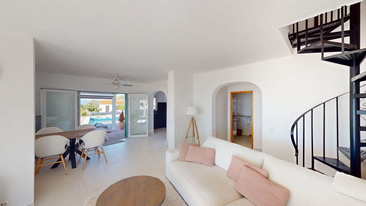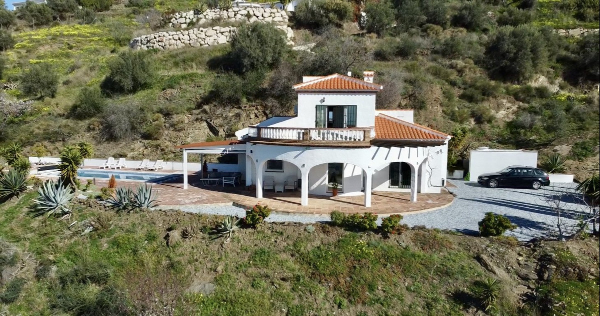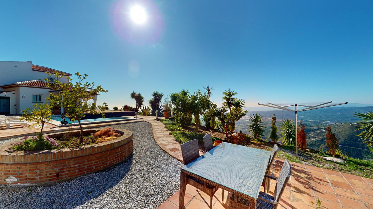 This recently renovated villa is located in a spectacular spot on Bentomiz Mountain in Arenas, just 5 minutes from the charming whitewashed village of Arenas, 20 minutes from the beaches of Algarrobo Costa, and 50 minutes from Málaga Airport, offering the perfect balance between tranquility and accessibility.   The property stands out for its brightness, modern design, and high-quality finishes, featuring a spacious open-plan living room, dining area, and a fully equipped modern kitchen with top-tier appliances, including a gas cooktop, oven, dishwasher, and integrated fridge-freezer. The dining area opens onto a covered terrace, perfect for relaxing or enjoying outdoor meals.   The villa boasts 3 bedrooms and 3 bathrooms, two of which are en-suite. On the ground floor, there is one bedroom with an en-suite bathroom featuring a shower, toilet, and sink, as well as air conditioning, and a second bedroom with a separate bathroom that includes a bathtub, shower, toilet, and sink. The master bedroom, located on the upper floor, features air conditioning, an en-suite bathroom with a shower, toilet, and sink, a walk-in closet, and direct access to a rooftop terrace offering breathtaking panoramic views and unforgettable sunsets. All bedrooms and the living room are equipped with ceiling fans for added comfort during the summer months.   The outdoor area includes an automated saltwater heated pool measuring 9.5 meters by 5 meters and an automatic irrigation system to keep the garden in pristine condition. The property also has a shared well and a water storage tank with a 12,000-liter capacity. Several terraces with shaded areas enhance the outdoor space, one of which can be enclosed with a retractable awning.   The villa is equipped with state-of-the-art technology, including 8 solar panels with a 6 kW inverter, central heating, hot water via a gas boiler, double-glazed windows and doors with anti-theft protection, a comprehensive security system with 24/7 monitoring, and a smart home system that controls lighting, the heat pump, solar panels, and water tank levels.   This property seamlessly blends comfort, style, and sustainability in a privileged setting. Contact us today for more information or to schedule a viewing, either in person or virtually.