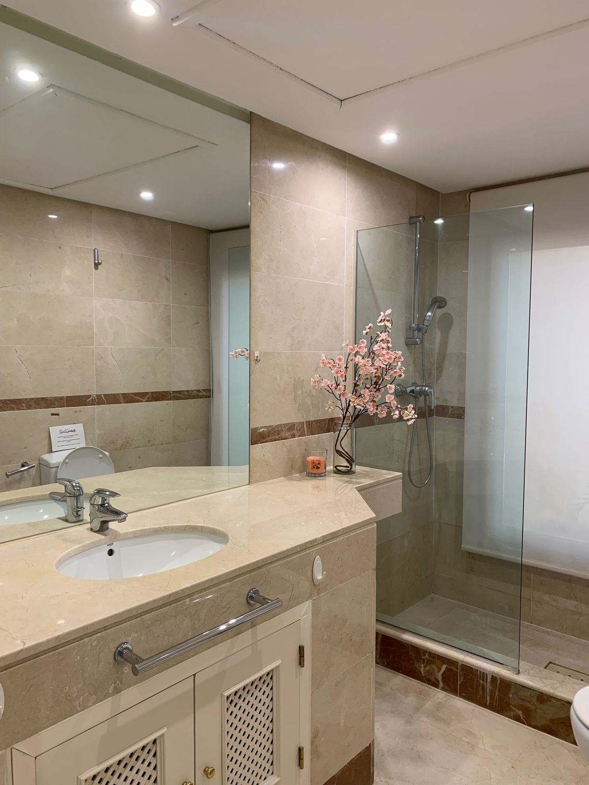 With 3 bedrooms and 2 bathrooms, the flat stands out for its impeccable design and brightness. Its spacious private terrace is perfect for al fresco dining all year round, as well as providing direct access to the swimming pool from the comfort of your home. The kitchen is fully equipped with modern appliances, while the bathrooms have the added convenience of underfloor heating.