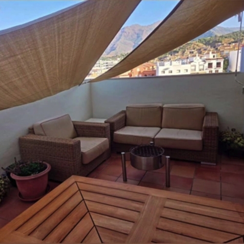 The home combines functionality with charm, offering a fully fitted kitchen, marble flooring, air conditioning, and double-glazed windows. A private roof terrace and additional outdoor spaces provide ample room for relaxation and entertaining. This is an ideal property for those seeking a well-positioned home in a secure and established community on the Costa del Sol.