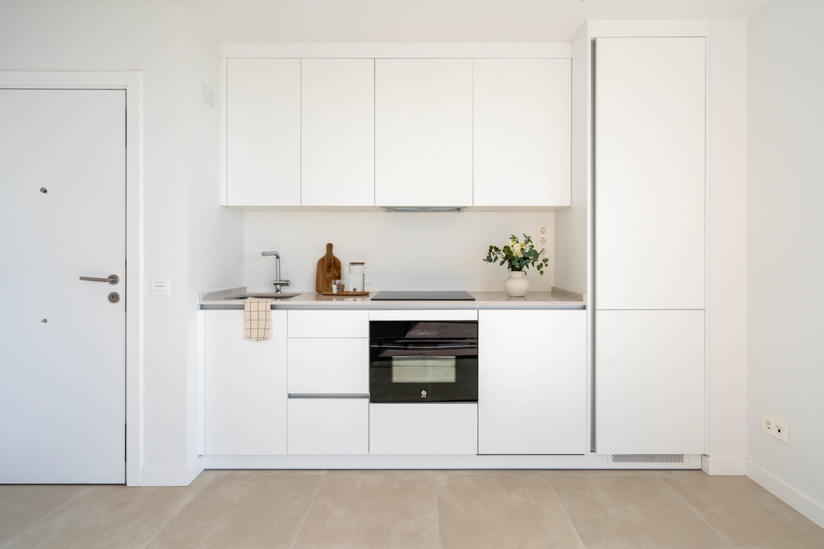 Det öppna vardagsrummet flyter harmoniskt ihop med den angränsande terrassen och skapar en inbjudande miljö som är som gjord för både avslappning i solen och minnesvärda stunder med familjen och gäster. Lägenheten har två rymliga sovrum, varav huvudsovrummet har ett eget badrum. I anslutning till hallen finns ett stilfullt gästbadrum. Luftkonditioneringen håller temperaturen behaglig året runt, och båda badrummen har golvvärme.
