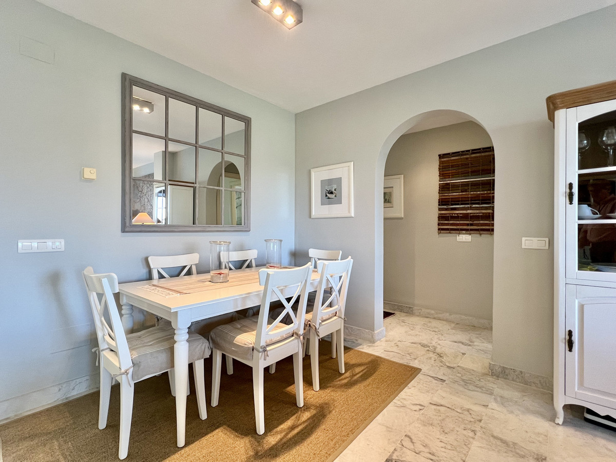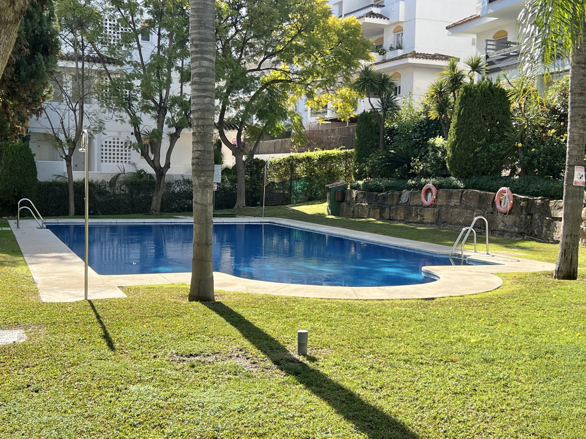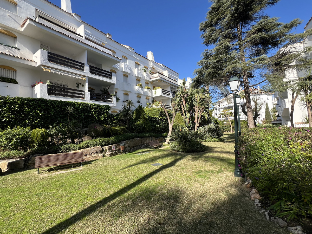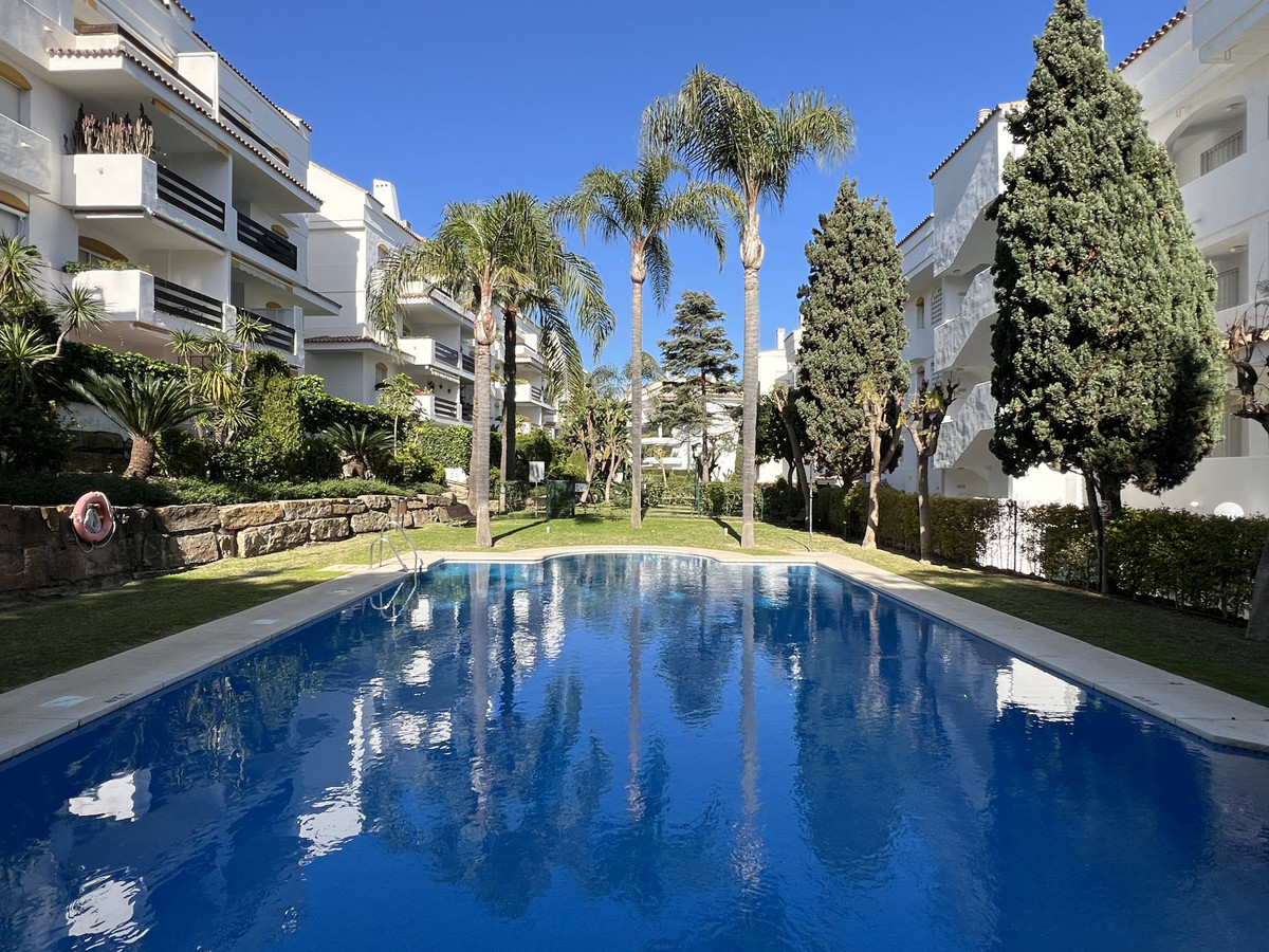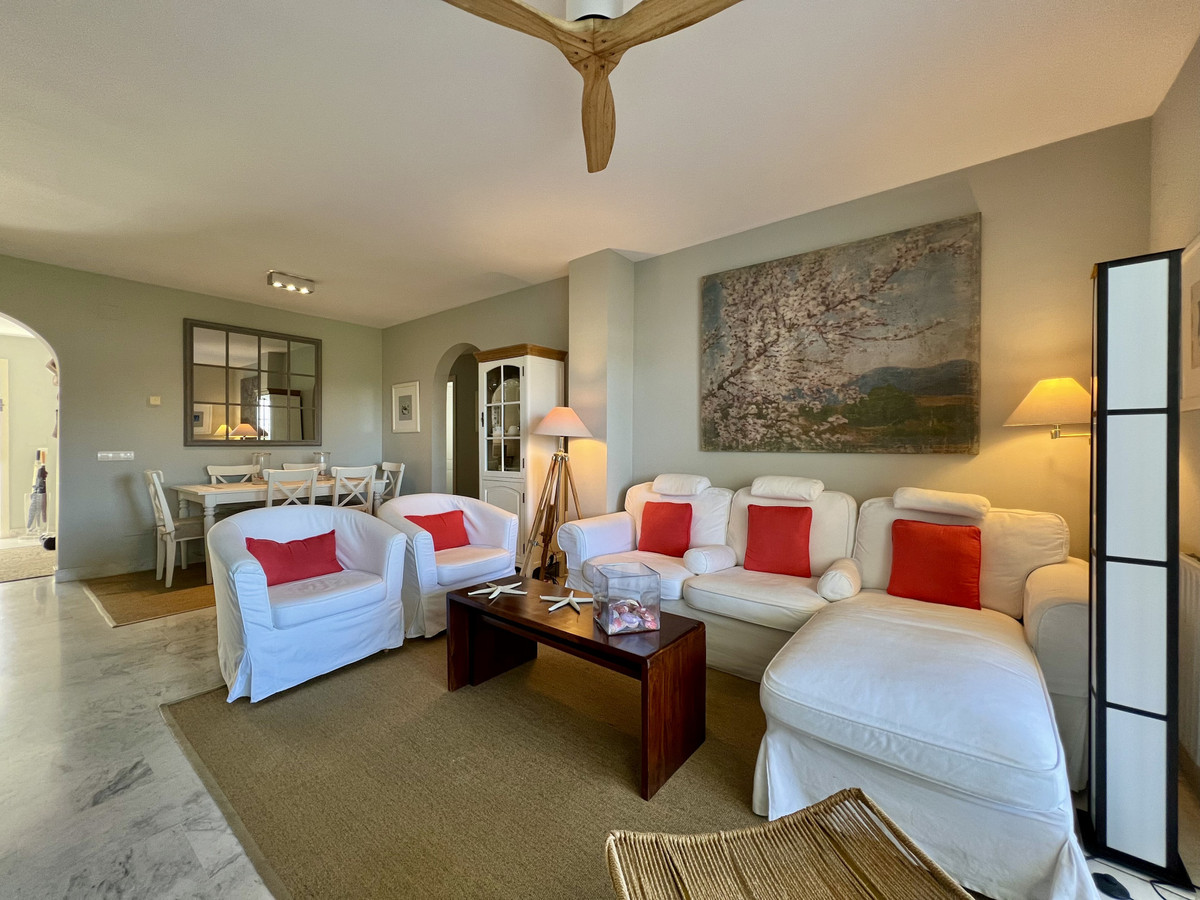 Beautiful front line golf corner apartment set in a nice residential beach side complex in Guadalmina Baja just a few steps away from the beach and the well known beach restaurants El Ancla, Macao and Barbillon. This lovely and extremely well keep apartment enjoy beautiful views of la Concha mountain of Marbella, the Guadalmina Golf and also side sea views. The gated complex offer communal gardens and swimming pool. The entrance hall opens on to a spacious living and dining room with fireplace, fully fitted kitchen with utility room. A separate corridor gives access to the master bedroom with ensuite bathroom, also to another two good size bedrooms sharing a bright bathroom. There is an underground private parking (15 m2) accessible by lift. 24 hours security.