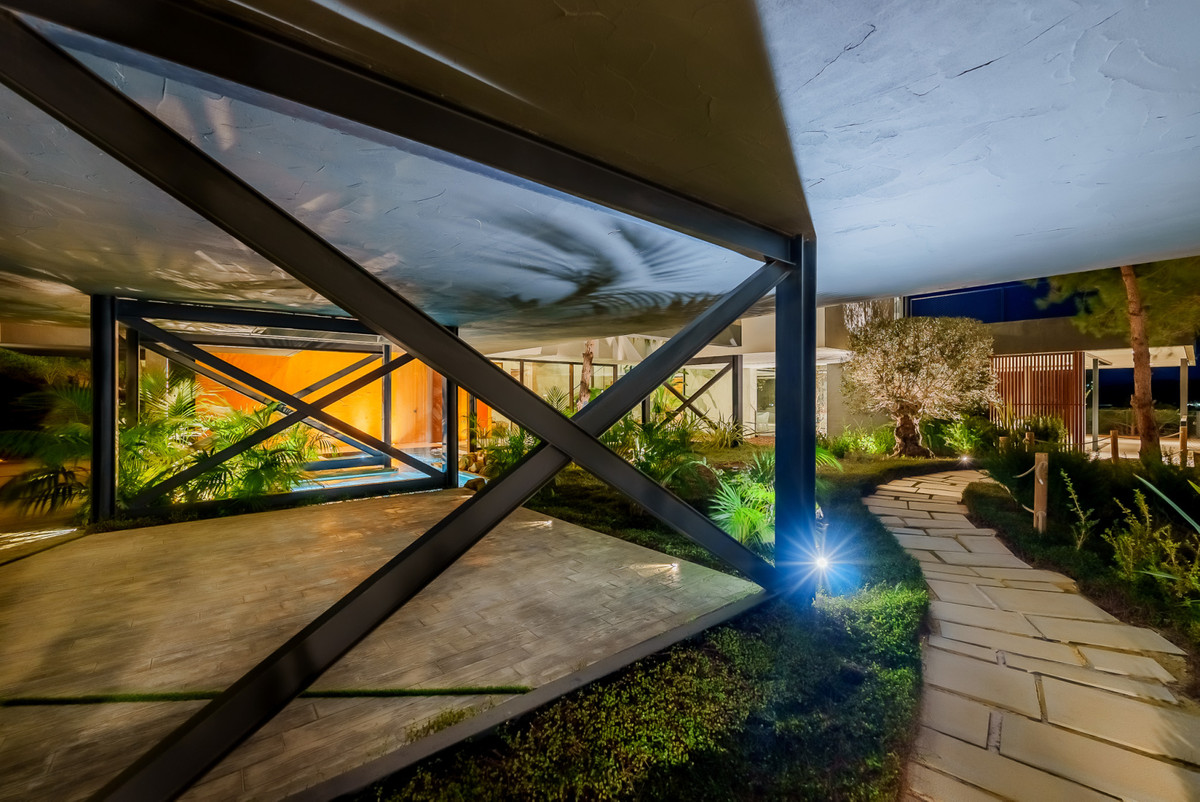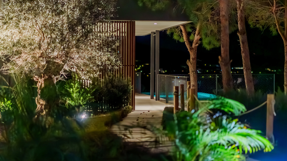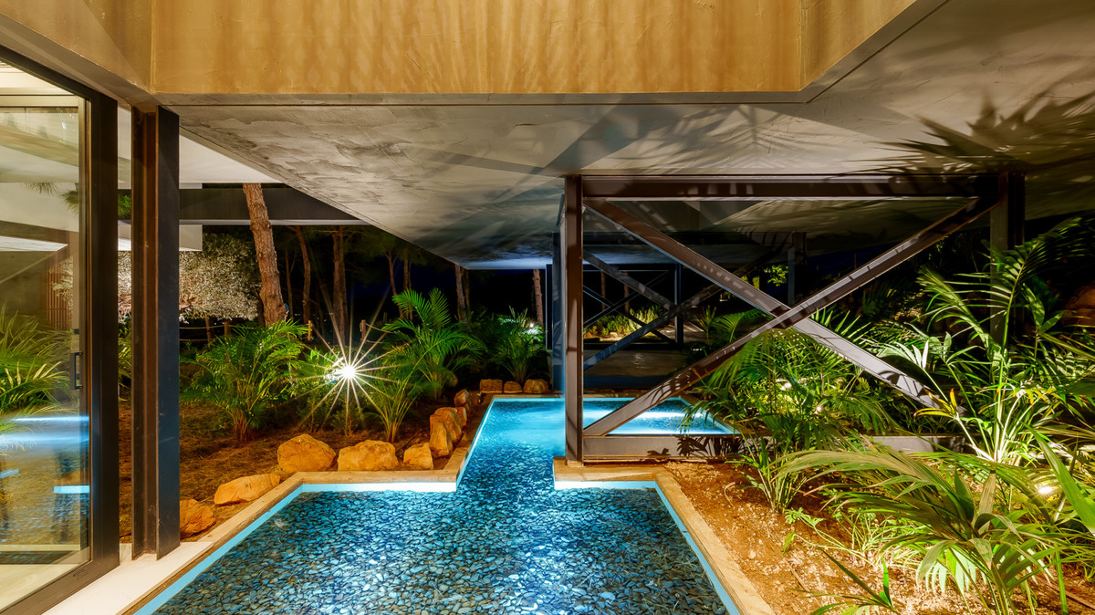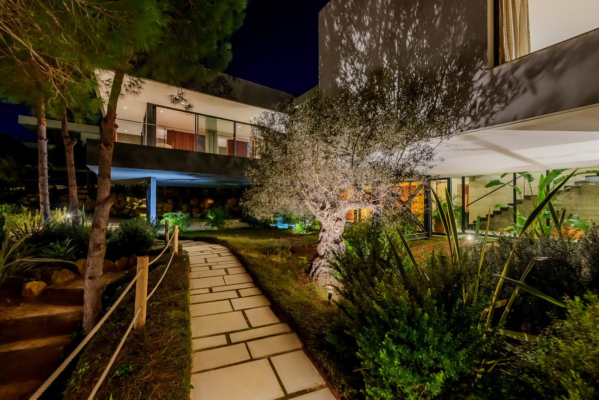 The villa's landscaping has been designed in collaboration with the University of Málaga, incorporating low-maintenance, water-efficient native plants. The illuminated garden features terracotta pathways and wooden beam steps that surround the property, creating a serene and natural environment.