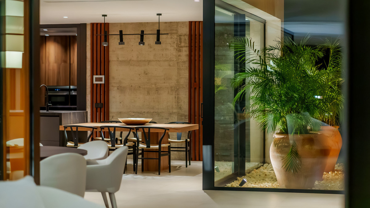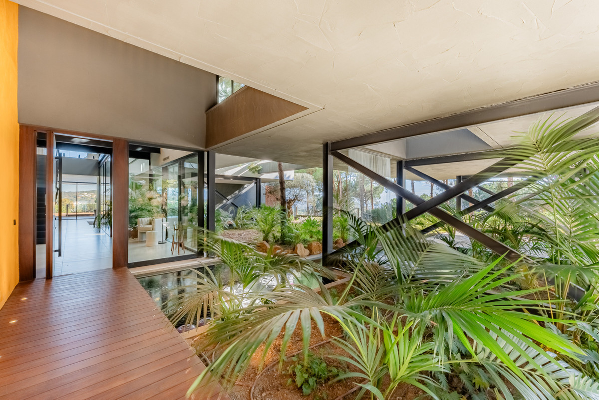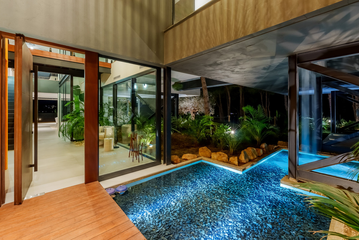 The villa's landscaping has been designed in collaboration with the University of Málaga, incorporating low-maintenance, water-efficient native plants. The illuminated garden features terracotta pathways and wooden beam steps that surround the property, creating a serene and natural environment.