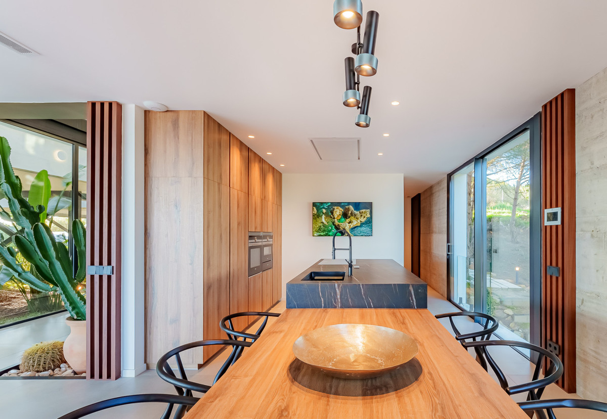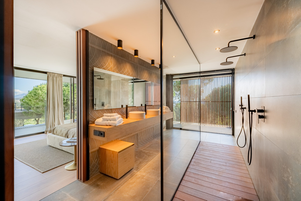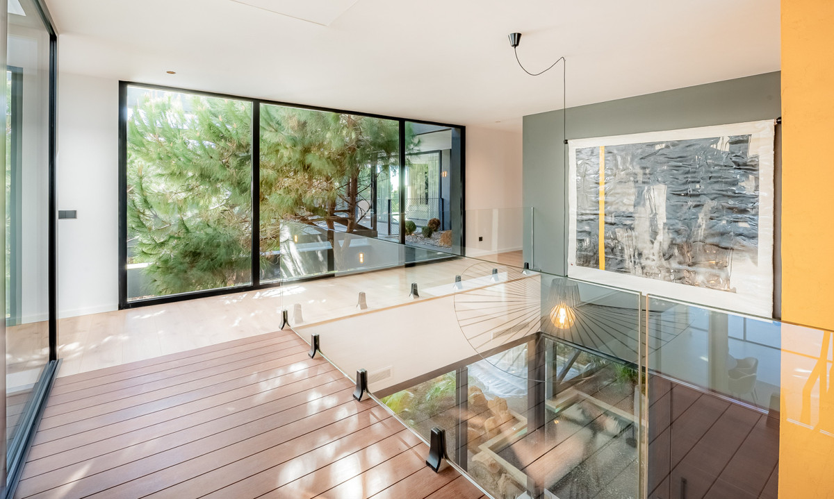Built over two levels, the villa offers a modern layout with open spaces and panoramic views of the Mediterranean Sea and Almenara Golf Course. On the ground floor, you are welcomed by a double-height entrance hall, surrounded by floor-to-ceiling windows that fill the space with natural light. From here, you access the spacious open-plan living and dining area, which seamlessly connects to the modern kitchen, fully equipped with high-end appliances. This space extends directly onto the stunning floating terrace, measuring 11 meters wide and rising 9 meters above the pine forest, with bamboo flooring and direct access to the infinity pool, offering breathtaking views of the sea and golf course. On this floor, there is also an independent laundry room with a washing machine and dryer, featuring direct access to the garden, as well as a guest toilet.