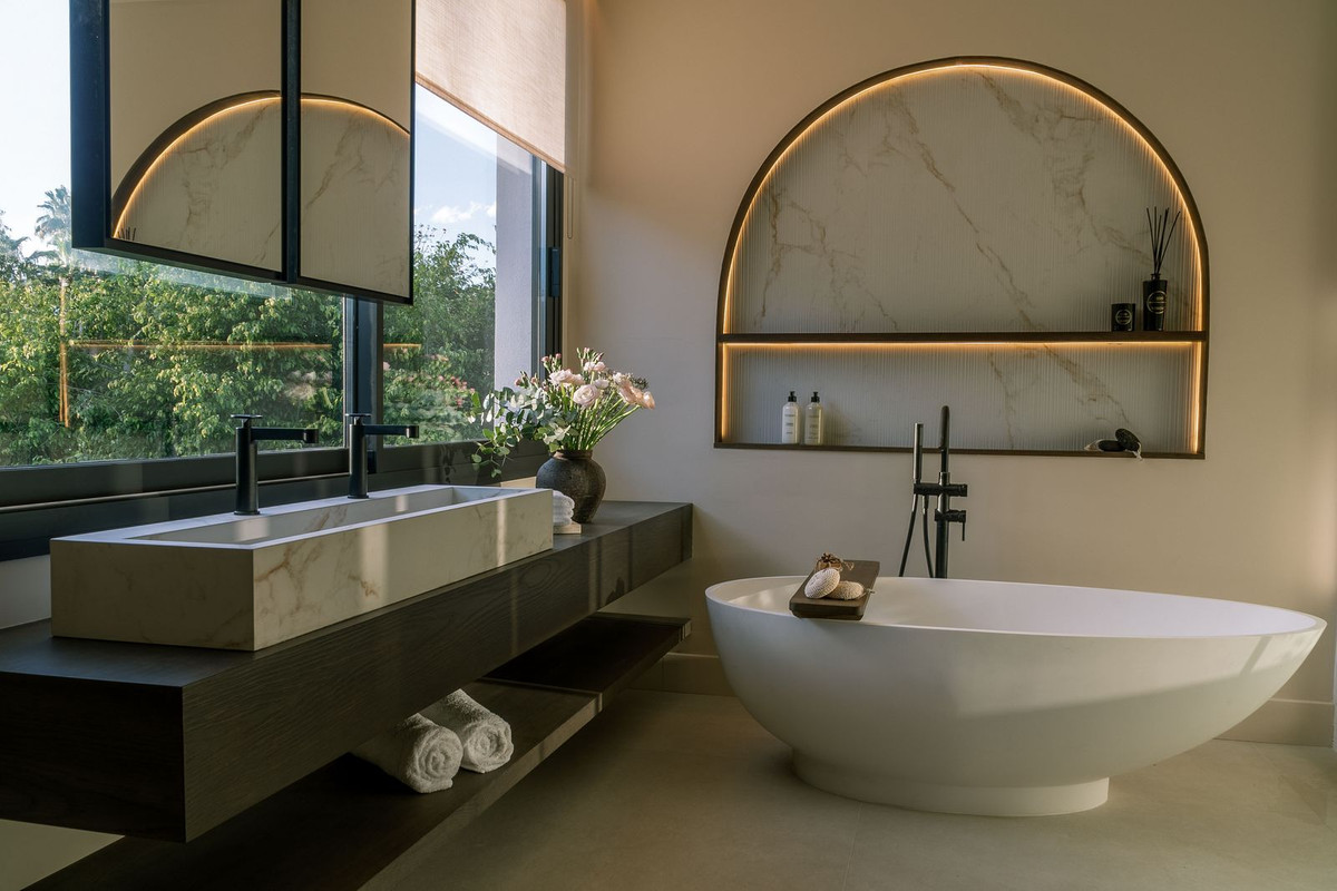 Välkommen till denna fantastiska villa i hjärtat av Nueva Andalucía, där avskildhet och modern bekvämlighet smälter samman på ett harmoniskt sätt. Nyligen renoverad i en lugn skandinavisk-Japandi-stil erbjuder denna unika bostad en elegant fristad som prioriterar komfort och harmoni.