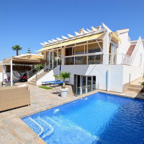 For sale beautiful detached villa in Los Altos - La Florida area, Orihuela Costa, Costa Blanca. We offer you for sale this detached villa with private garden in Los Altos - La Florida area.The house is situated in a very quiet area but at the same time within a short drive from the famous golf courses of Villamartin, sandy beaches of Orihuela Costa which are awarded from year to year by "Blue Flag" for their cleanliness, the biggest shopping center La Zenia Boulevard and many other amenities, which will guarantee you the comfortable life in the southern coast of Costa Blanca.The property is built on several levels and consists of 3 spacious bedrooms with built-in wardrobes, 2 bathrooms, spacious living-dining area, traditional and fully equipped kitchen with breakfast bar, cozy balcony, private solarium and incredibly large basement, which can be converted into a separate guest apartment or to be used like a garage/storage space. There is a natural gas heating, and the community where it is situated offers to its residents nice communal swimming pool.The house comes fully furnished, which means you can move in without complications and start enjoying your spaces from day one. The garden, with its trees and relaxing areas, becomes the perfect setting for your family gatherings and outdoor moments. The solarium offers you a corner of tranquility for your moments of reflection. This property is an ideal place to live with your family!