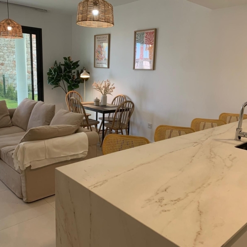 This fabulous resale corner apartment boasts 3 spacious bedrooms and 2 beautifully designed bathrooms, ensuring both comfort and style. The open-plan living and kitchen areas are designed with seamless flow, perfect for everyday living and entertaining. Expansive floor-to-ceiling windows bring in abundant natural light and offer breathtaking views of the lush surroundings, with many residences enjoying vistas of the Mediterranean Sea. Additionally, generous terraces and private gardens (up to 156m²) provide ample outdoor space to relax, dine, or soak in the inspiring landscape.