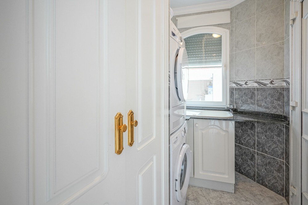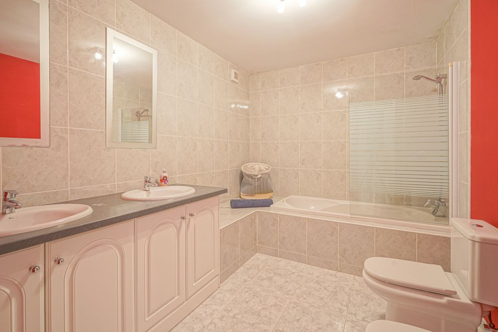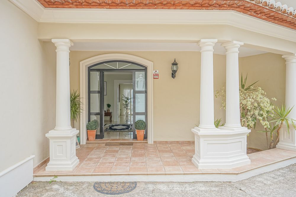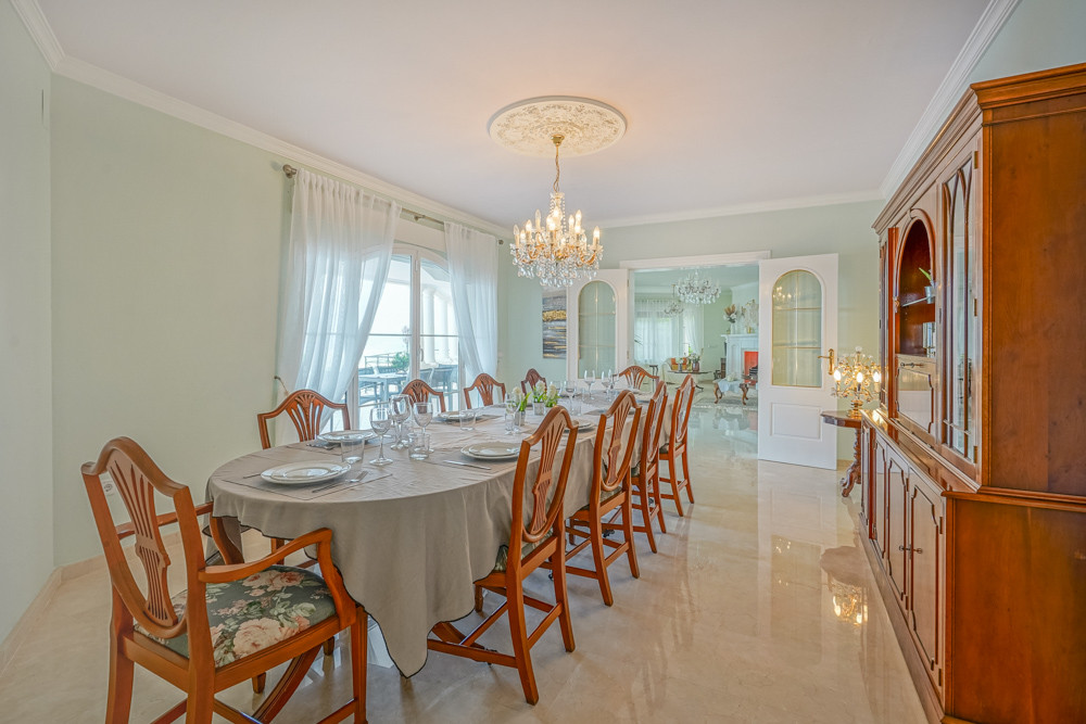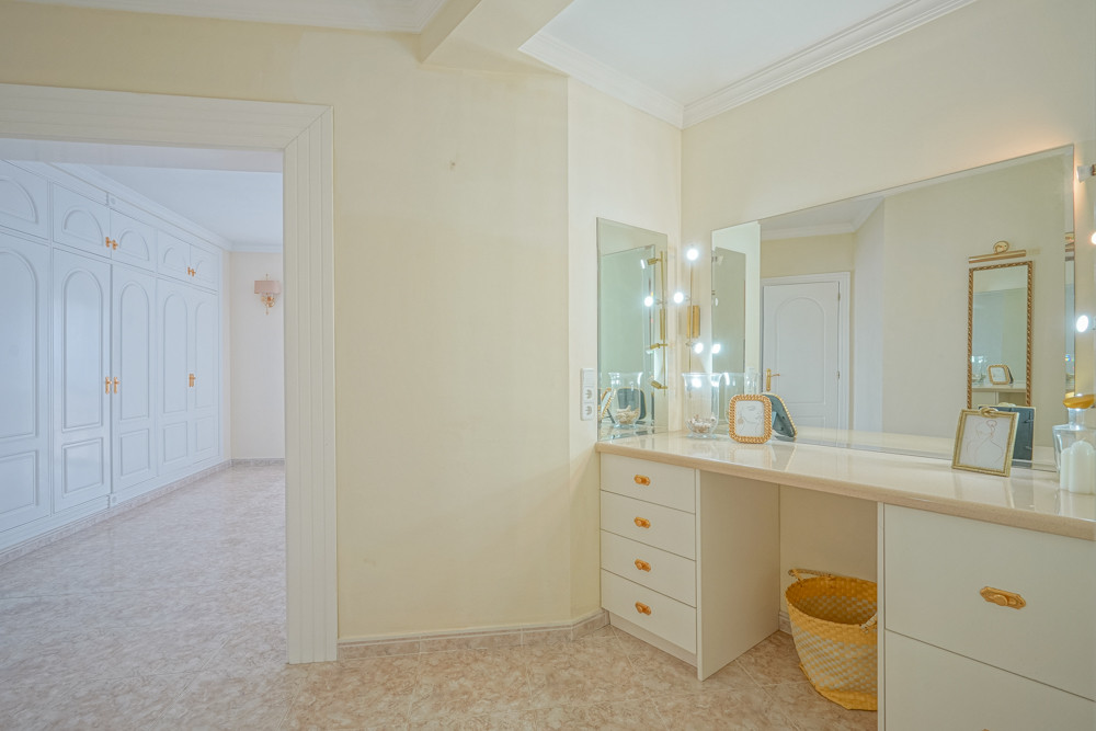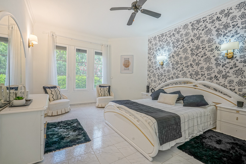 The villa is distributed over three floors and has a total of six bedrooms and five bathrooms. You enter the house through a majestic entrance hall with two double bedrooms, one on the right and one on the left, one of these bedrooms has an en-suite bathroom. Continuing down the hallway we find a very spacious living room with a lounge with a fireplace along with a dining room and a TV room.
