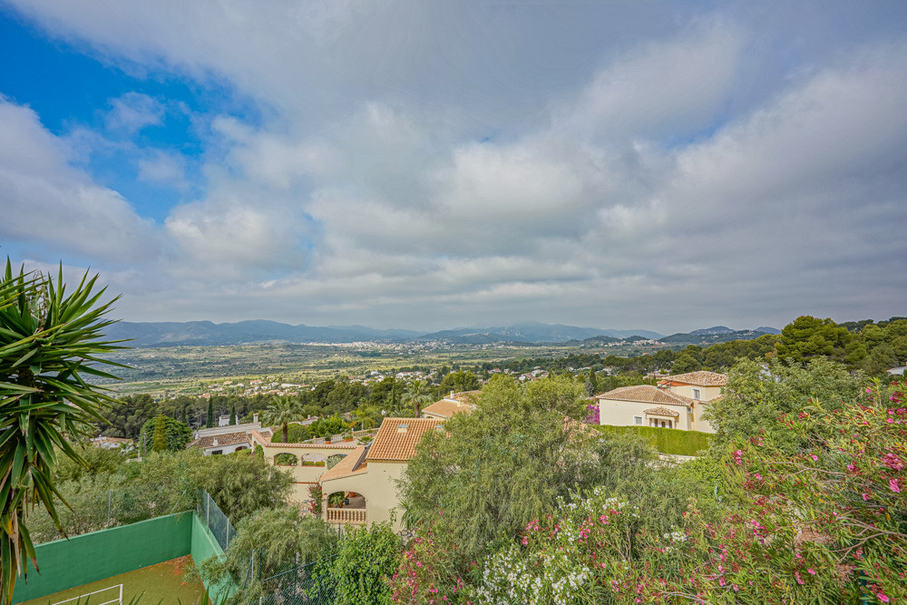 A few steps down there is a large swimming pool with jacuzzi and a barbecue with bar. Further down there is a lawn garden and a tennis court. On the other side of the villa there is a large driveway and a garage. The villa is surrounded by a variety of plants and trees. In only 10 minutes you can reach the town centre of Jávea, where you can find all facilities.