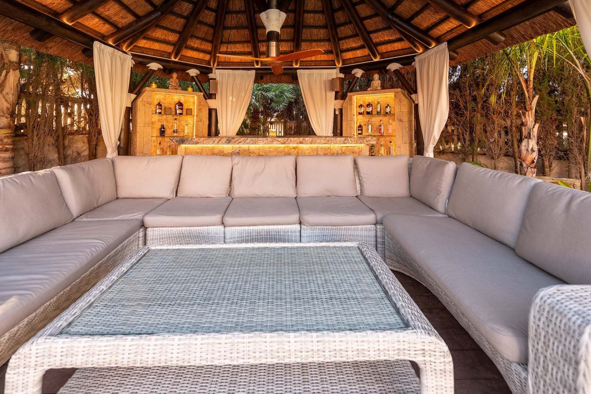 The garden features a wide variety of plants, fruit trees, lush palm trees, and century-old olive trees. The pool area is surrounded by decking and grass, perfect for sunbathing. For relaxing and enjoying summer nights, there is an African Reed chill-out area complete with its own bar.