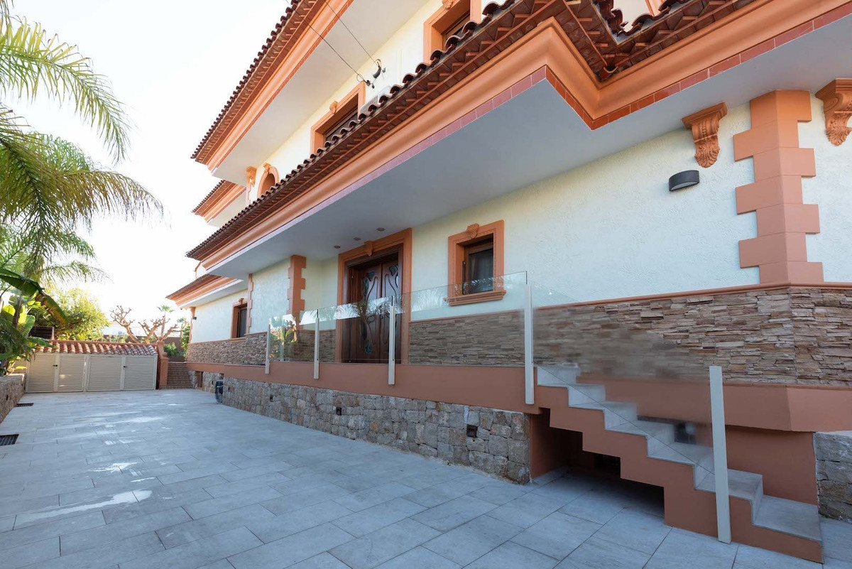The property includes an entrance hall; an interior carved wooden staircase leads to the upper area where we find three spacious and bright bedrooms with built-in wardrobes, two of them with walk-in closets, and three en-suite bathrooms.