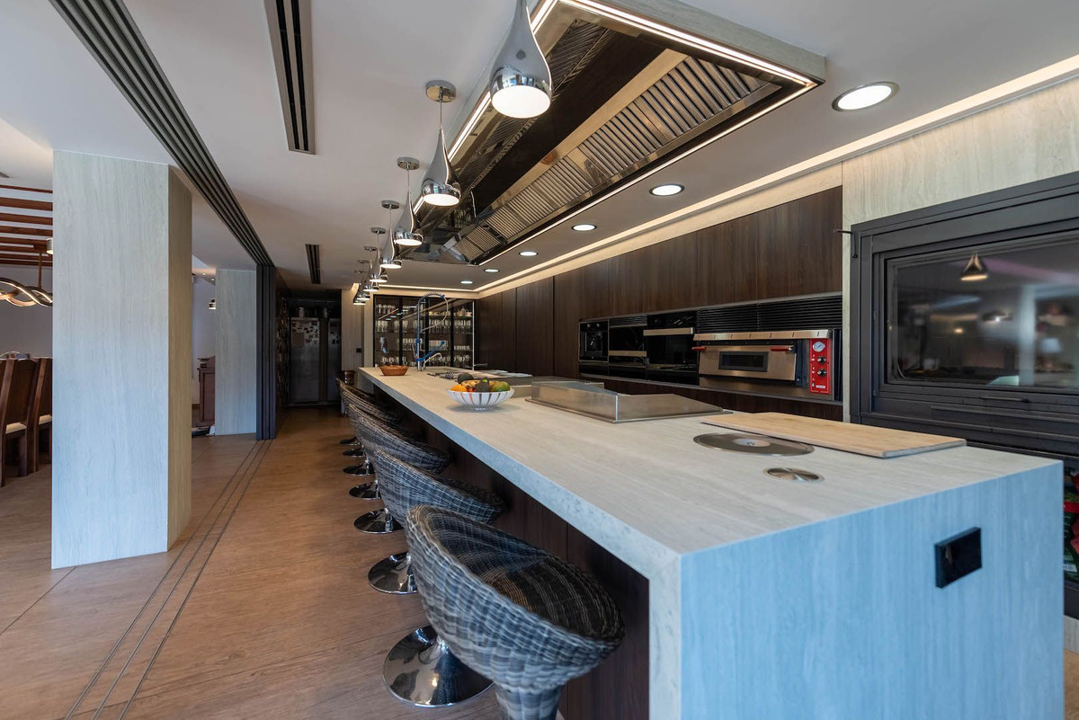 On the main floor, there is a fourth bedroom with an en-suite bathroom, a guest toilet, and a large, bright living-dining room carefully decorated with neutral colors complemented by vibrant accents. Large windows allow natural light to fill the living room, the billiard area, and the stunning high-end industrial kitchen equipped with the latest appliances, making cooking a harmonious pleasure.