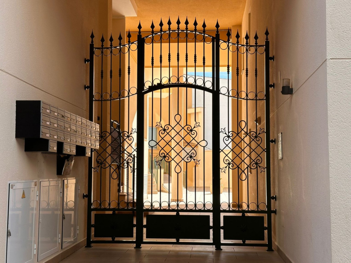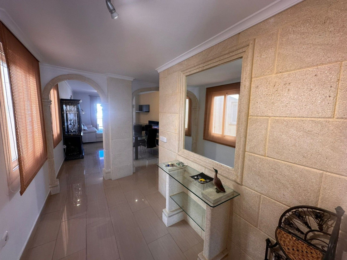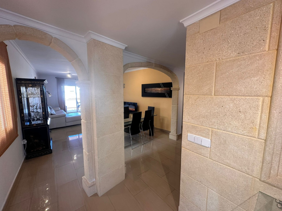 The apartment's interior is tastefully decorated, featuring a stunning stone archway and pristine marble flooring throughout. This property also includes access to the roof terrace, where you can enjoy breathtaking sea views.