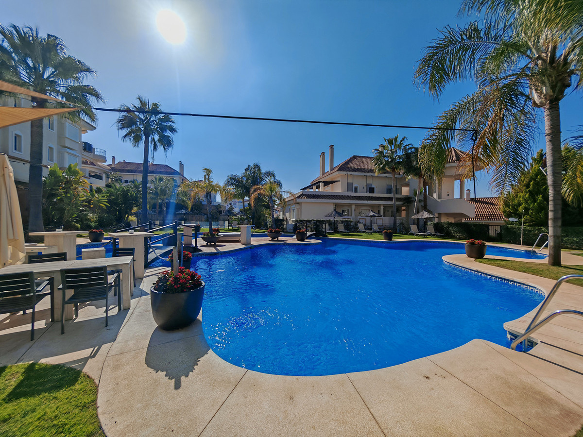 Apartment for sale in , Marbella with 2 bedrooms, 2 bathrooms, 1 on suite bathroom and with orientation south/west, with communal swimming pool, private garage and communal garden. Regarding property dimensions, it has 99 m² built and 52.4 m² terrace. Has the following facilities amenities near, transport near, air conditioning, fully fitted kitchen, storage room, barbecue, security service 24h, private terrace, sea view, mountain view, covered terrace, 24h service, electric blinds, fitted wardrobes, gated community, pool view, close to sea / beach, open plan kitchen, good condition, close to shops, close to town, close to schools and close to restaurants.