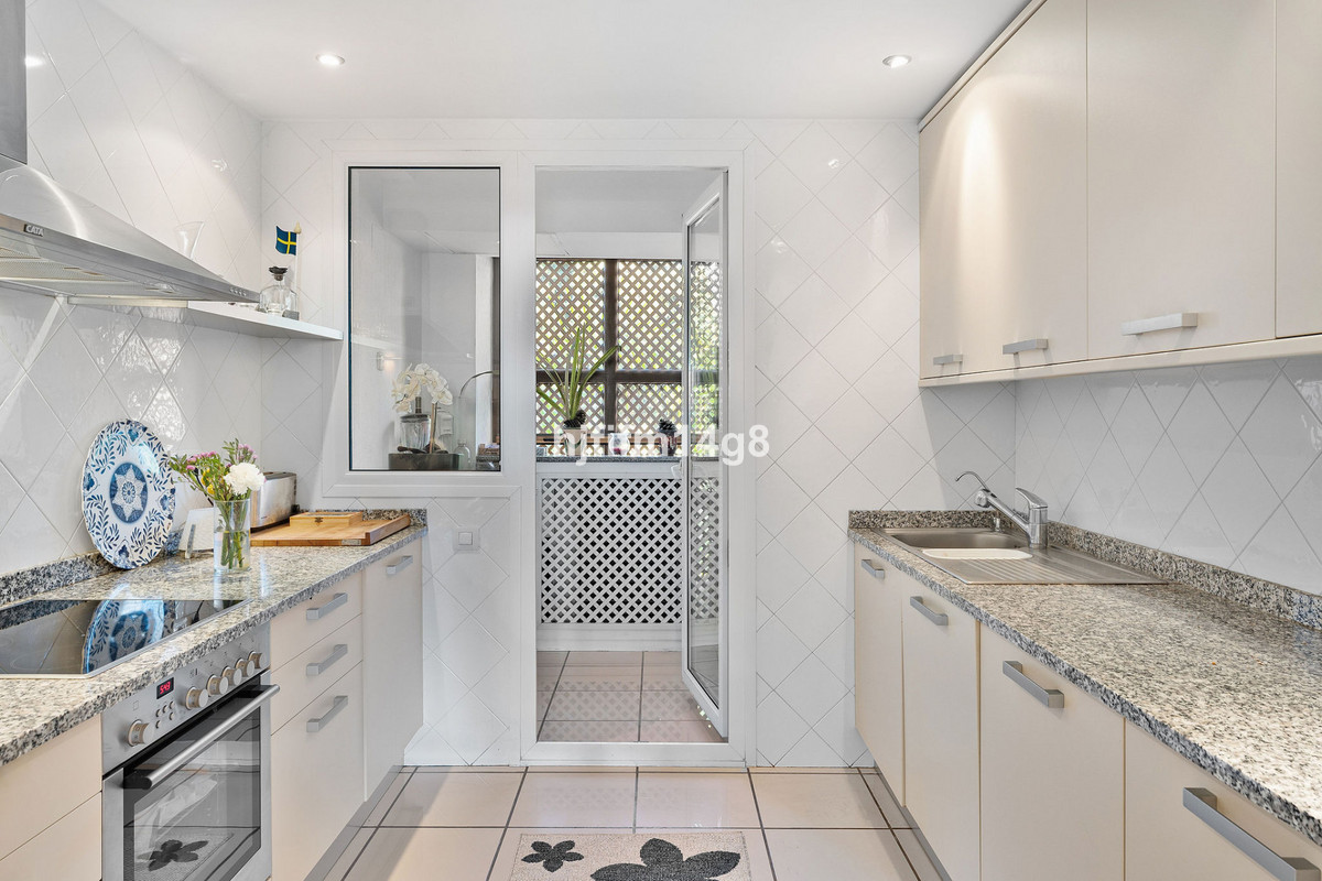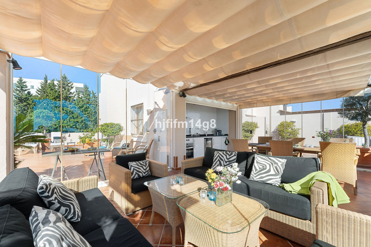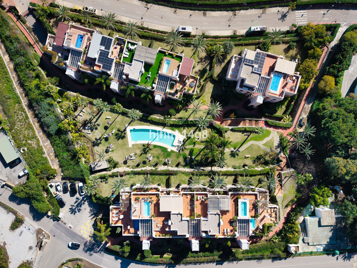 Höjdpunkten i denna takvåning är takterrassen, ett extraordinärt utomhusutrymme som verkligen är unikt. Terrassen är uppdelad i olika områden, vilket erbjuder en perfekt balans mellan komfort och funktionalitet. När du går upp till takterrassen, är den första sektionen till vänster fylld med utrymme för avkoppling, härifrån når du ett helt inneslutet område med glasgardiner, med ett kök, matplats och loungeområde, allt vackert täckt för att erbjuda komfort året runt. Fortsätter du genom detta utrymme når du en annan charmig del av terrassen med solstolar, perfekt för att njuta av solen. Några steg upp härifrån leder till den privata uppvärmda poolen, där du kan njuta av panoramautsikt medan du simmar i absolut avskildhet. Terrasserna är vackert anlagda, med krukade fruktträd och frodiga växter, vilket skapar en oas av grönska och lugn. Totalt utrymme på 170m2.