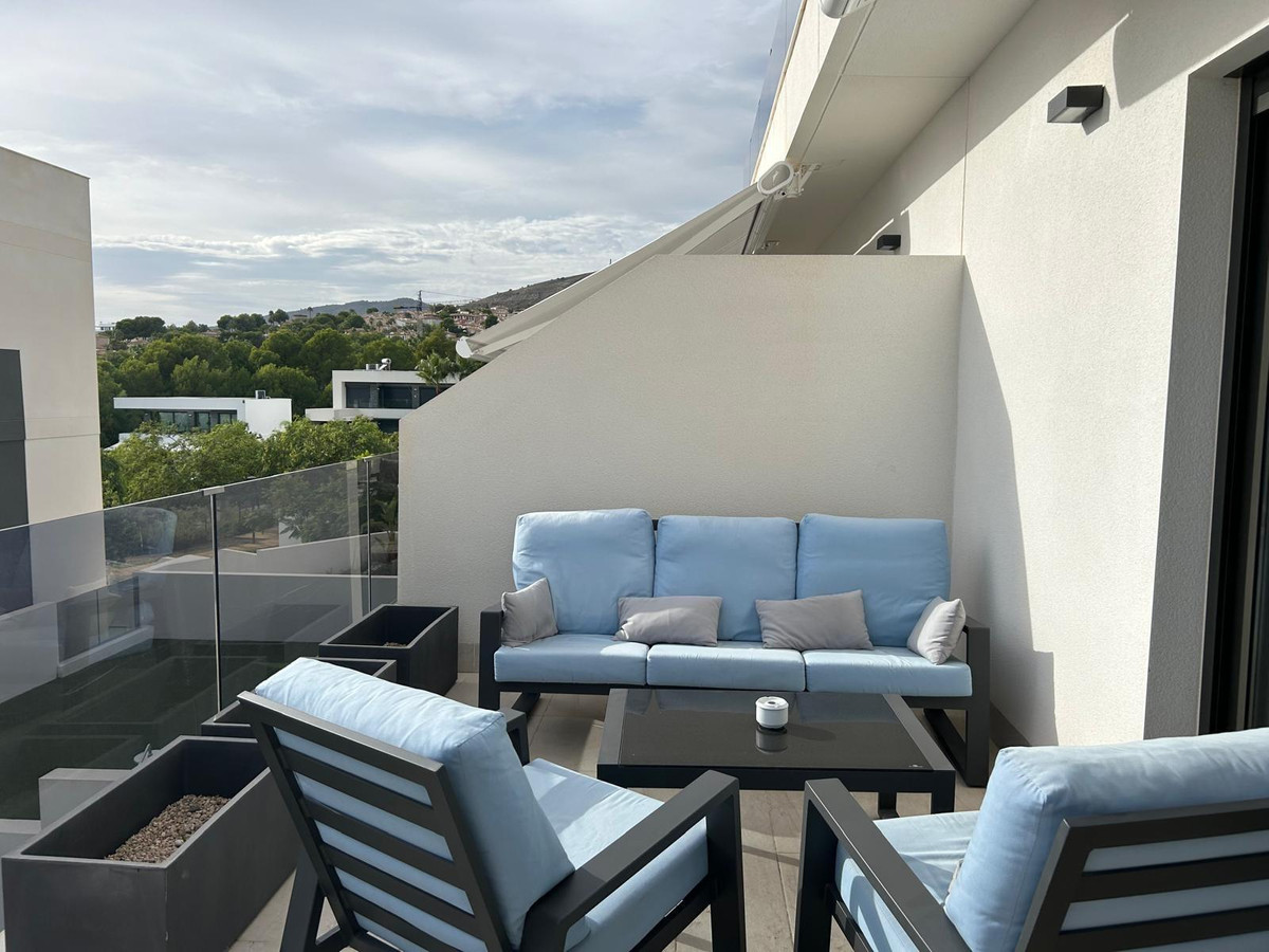 Great, semi- new apartment in Sierra Cortina with sea views!One of the finest properties on the Costa Blanca!This apartment offers 77 square meters of usable space, thoughtfully designed for comfort and convenience. Interior layout:- A spacious living room with a fully equipped, American-style kitchen and direct access to a large terrace, which also connects to the master bedroom.- The master bedroom is a generous double room with a built-in wardrobe and en-suite bathroom featuring a shower.- A second bedroom with a built-in wardrobe and large window provides ample natural light.- An additional full bathroom is available for added convenience.Features of the urbanization:- Large communal areas with two swimming pools: a large one and a children's pool with a waterfall.- Fully equipped gym.- Sauna and jacuzzi for communal use.- Barbecue area and children's playground.- Private parking and storeroom.Location:Ideally located near all essential services, the apartment is just a 10-minute walk from a major shopping center and public transport stops (bus and tram). It's 30 minutes from Alicante International Airport and close to popular attractions like Terra Mítica and Aqualandia. Plus, the beautiful beaches of Benidorm are only 3 km away.This property combines modern living with top-notch amenities, making it perfect for both holiday stays and long-term residence.