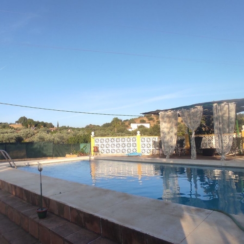 The plot has a built house and a swimming pool that is unfinished.