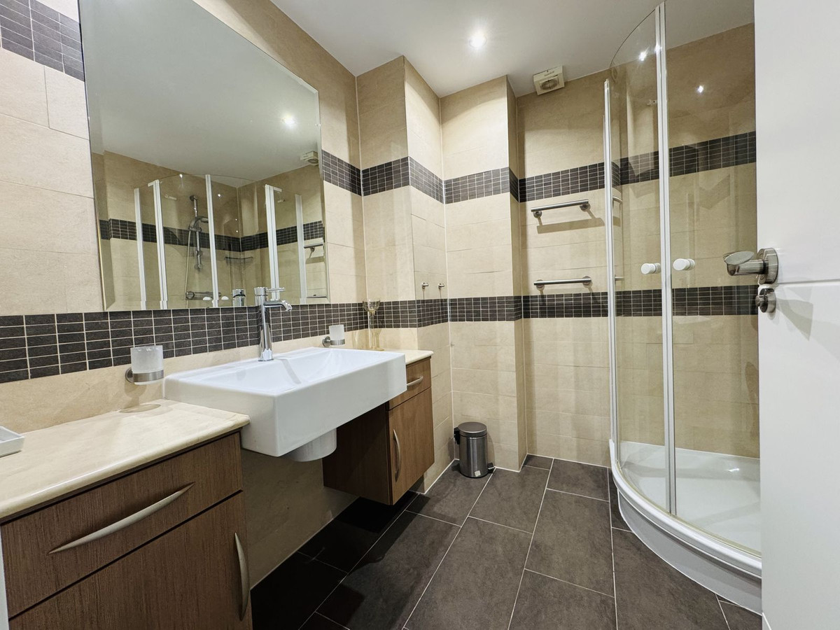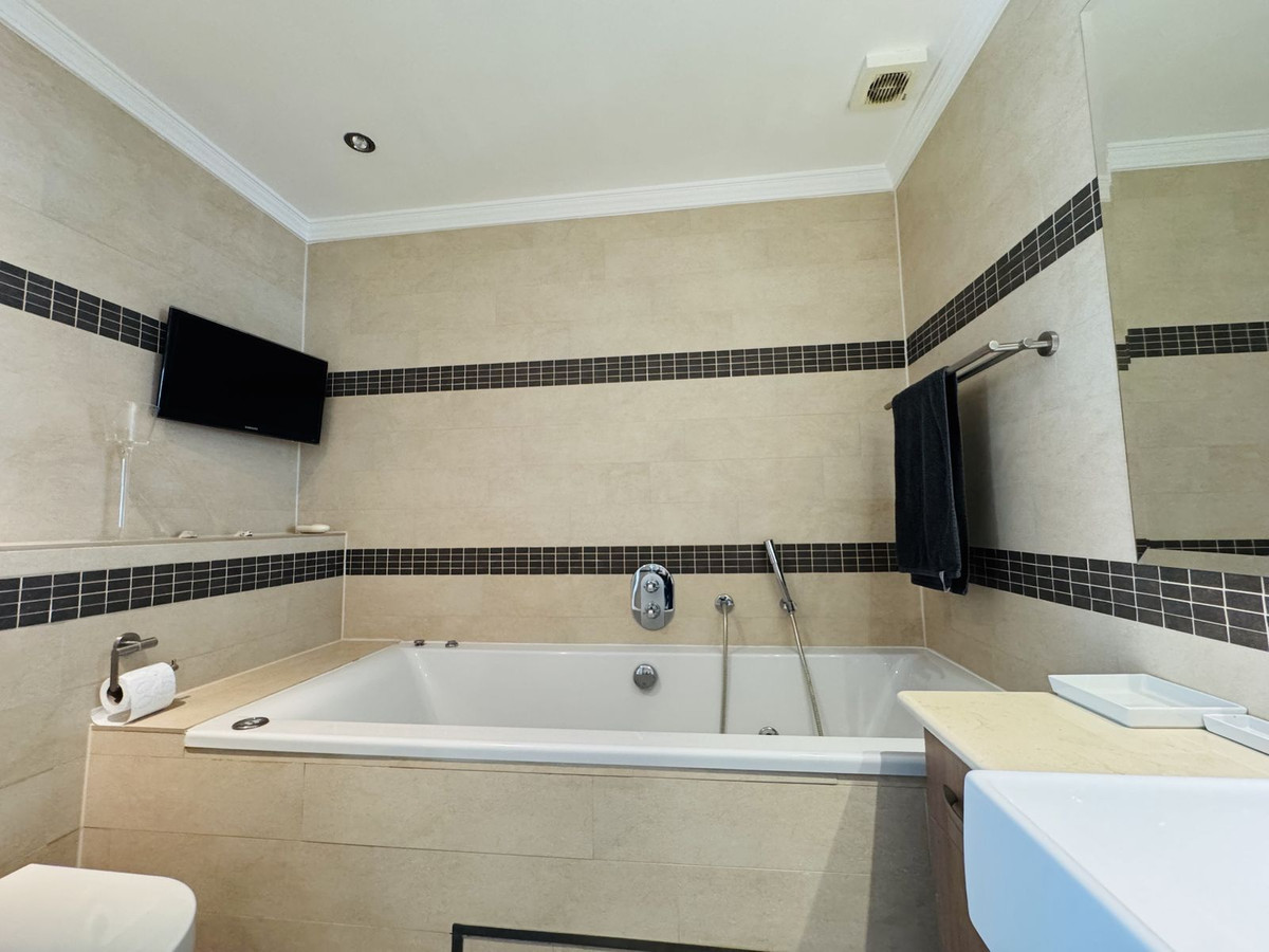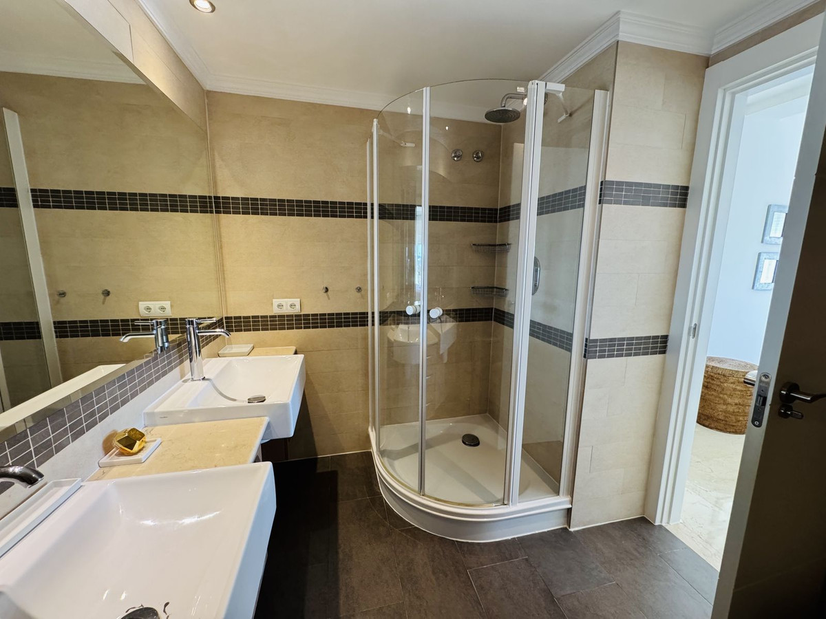 The master bedroom has a dressing room and ensuite bathroom, while the other two bedrooms offer sea views and built-in wardrobes. The bathrooms are equipped with a shower and bathtub for your comfort. A large closed garage of 46.41 m2 valued in 100.000€ is included in the price.