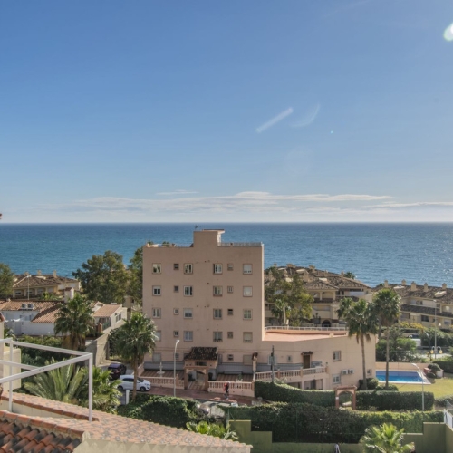 Vacker takvåning med 2 terrasser i västerläge i Torrequebrada. 2 sovrum, 2 badrum, varav ett ensuite. 2 stora privata garageplatser och ett rymligt förråd ingår i priset. Mycket välskött och lugnt bostadsområde, turistuthyrning är inte tillåtet. Gemensam trädgård och pool. Gångavstånd till restauranger, caféer, mataffär, apotek, busshållplats samt stranden. Granne med Torrequebrada Golf Club.