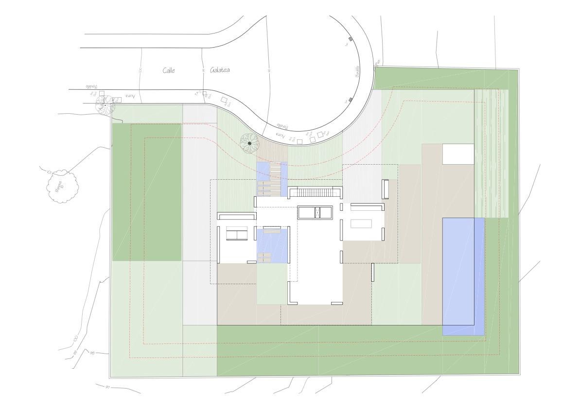 Med UE-3 zonreglering tillåter 800 m2 tomten en 317 m2 villa spridd över två nivåer, inklusive en takterrass och källare, plus 100 m2 utomhus terrasser för sömlös inomhus-utomhus levande. En carport för två fordon ingår också i planerna.