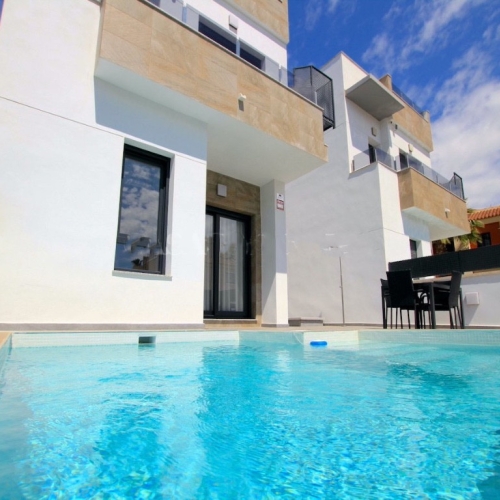 The villa features three double bedrooms, two bathrooms with underfloor heating, an open-plan kitchen, and a spacious and bright living room. From the living room you can accees direct to the outside,  area where you'll find an easy-to-maintain garden and a generously sized private pool.