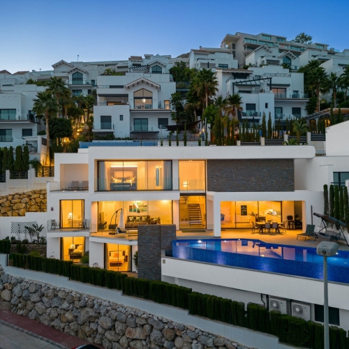 Wonderful brand new luxury villa, in one of the most sought-after areas of Benalmádena, in the heart of the Costa del Sol. This incredible property has an eight hundred meter garden, with an infinity pool where you can enjoy the warmth and sun of summer.On the first floor we will be greeted by the enormous living room with a fireplace and a door with access to a 150-meter terrace. The master bedroom has its own bathroom en suite and an unparalleled large dressing room.Upon going up to the second floor we will We will find two bedrooms and a bathroom. In the basement we can get in shape with the gym. Without leaving us the garage for two cars included in the property. This home will not leave us immune to its beauty, the luminosity and the energy of a job. well done. The panoramic views will lead us to the majesty of the sea and the mountains.