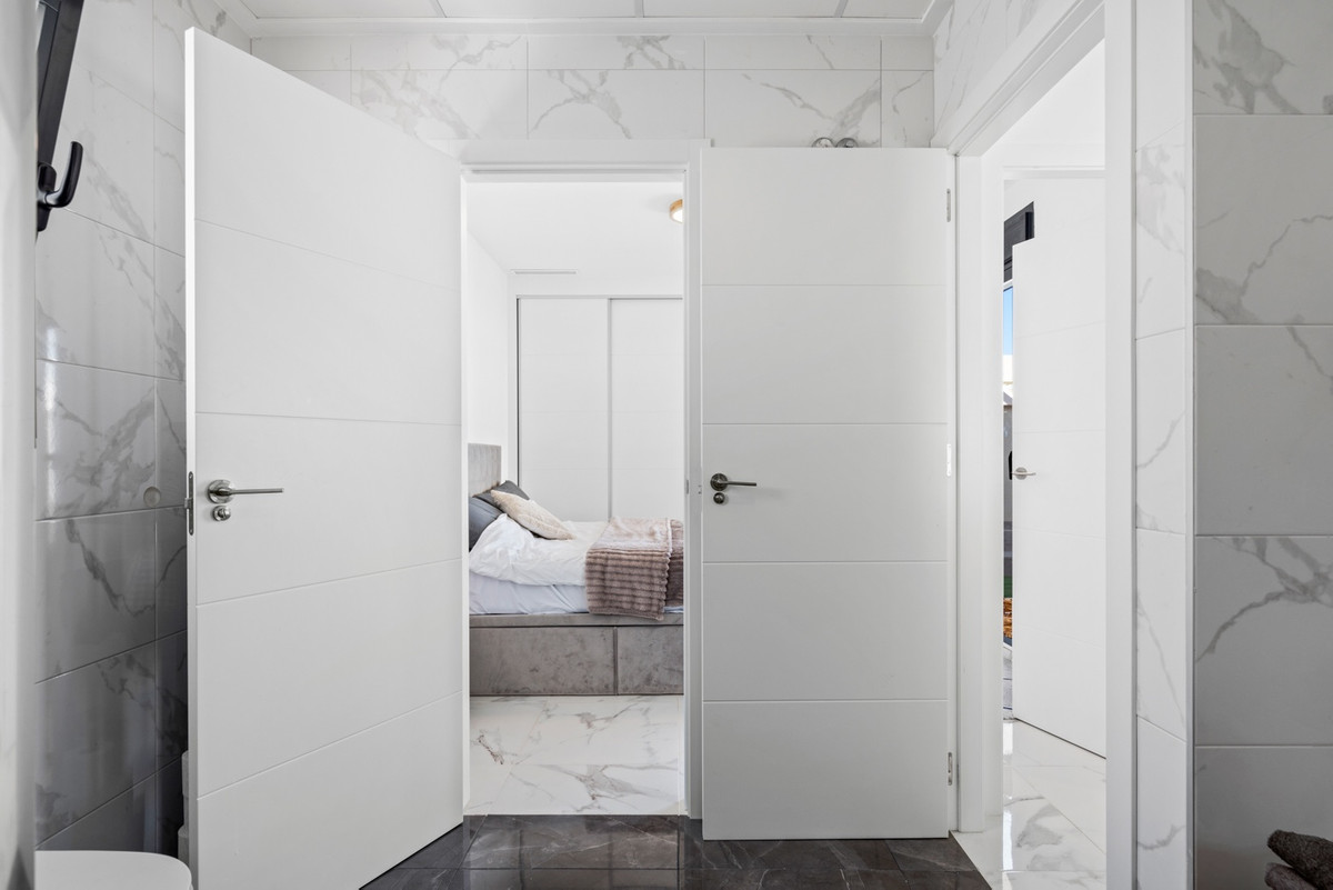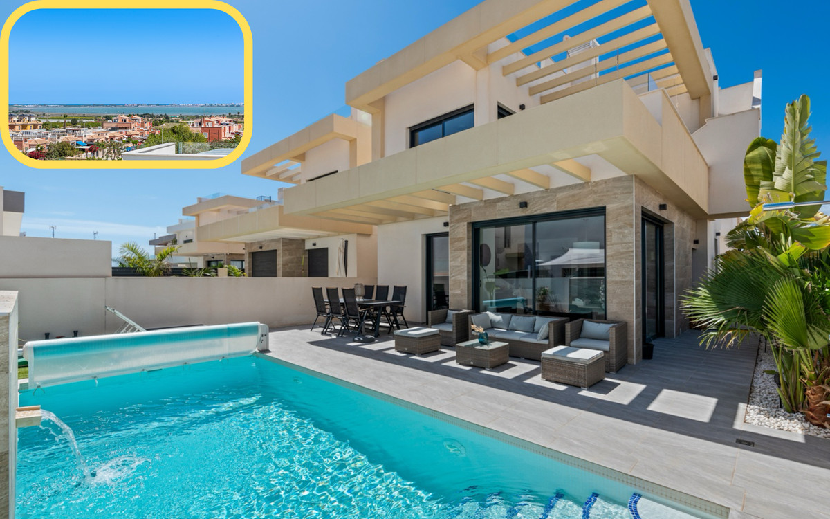 Welcome to our newest exclusive listing in La Herrada, Los Montesinos. Costa Blanca, Spain!The first thing to note about this beautiful & well maintained property is that it is the perfect choice for someone who wants the beauty and quality of a new build property but without the wait for one to be built. It is a fantastic 3 floor villa with 3 bedrooms and 2 bathrooms and with a nice outside space, and it is sold as seen. With all furniture included. The best start to owning a beautiful Spanish home is to own a modern home that is ready to go!New Build villa with 3 bedrooms and 2 bathrooms, open plan kitchen with living room-dining room. Special about this property is that the living room area is extra large! This villa has a bigger living room without losing any useful space for the rest of the house! The open kitchen is very practical and comfortable. It includes a large island that unites the entire space and helps you create a very spacious, large room, in which you can create different environments: a formal dining room to receive your guests, a very homely living area with some bohemian details, a little corner with some games for the children….The large windows of this wonderful room fill the house with the warm light of the Mediterranean and unite the interior with the terrace and the garden, and, above all, with the pool. A true oasis where you will spend the days and nights, having fun, laughing and enjoying with yours. The villa has a private swimming pool from 7x3M with a built in waterfall. There is also the possibility to park your car on your own property driveway. On the second floor are 2 bedrooms, one of the bedrooms is the master suite, with a private bathroom, is spacious, comfortable and intimate, and offers fantastic views. You also have direct access from both bedrooms to the terrace. In addition you have a magnificent solarium that will be your private paradise, your private corner where you can disconnect and relax as you deserve.The typical town of Los Montesinos is strategically located 10 minutes by car from the beaches and leisure of Torrevieja (with all the services of a big city: theatre, 2 hospitals, international schools, etc.), from several golf courses and with easy access to the A7 highway to reach Alicante airport in 35 min.In the urbanization there are supermarkets and bars for day-to-day service, being a rural and quiet environment. The climate in this area guarantees 300 days of sunshine a year with an average temperature of 20ºC, which, together with the rich gastronomy and cultural and sports activities available in its surroundings, makes this area an ideal place to establish a second residence for vacation or a quiet place to live permanently.