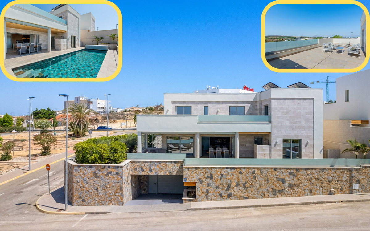 Discover unparalleled luxury in this beautiful villa in the heart of Benijofar This exceptional custom-built villa embodies modern elegance and comfort in a peaceful, inviting setting, just minutes from all essential amenities, making it the perfect family home or holiday retreat. Upon entering, you're greeted by an open and airy layout designed for seamless indoor-outdoor living. The ground floor features a spacious bedroom with built-in wardrobes and a luxurious en suite bathroom. One of the villa's most unique features is its direct access to the pool: simply slide open the large glass doors and you can dive into your private oasis. Upstairs you will find three more spacious bedrooms, two of which have en-suite bathrooms, ensuring maximum privacy and comfort. The crown jewel of the top floor is the expansive solarium, where you can enjoy stunning panoramic views. It's the perfect spot for sunbathing, entertaining guests, or enjoying serene sunsets. The villa also features a large basement with ample space for a garage and additional storage. The spacious basement offers endless possibilities, with the potential to be transformed into an additional living space, entertainment area, or guest suite, adding comfort and versatility to your lifestyle. A state-of-the-art water purification system provides clean, purified water throughout the house, highlighting the attention to detail in every corner. This luxury villa combines first-class design, location, and amenities, offering the ultimate in Mediterranean living. Don't miss this opportunity to own a slice of paradise in Benijofar!