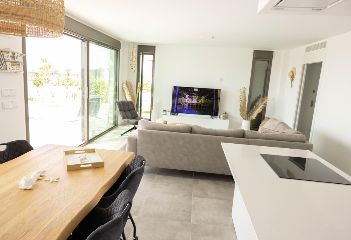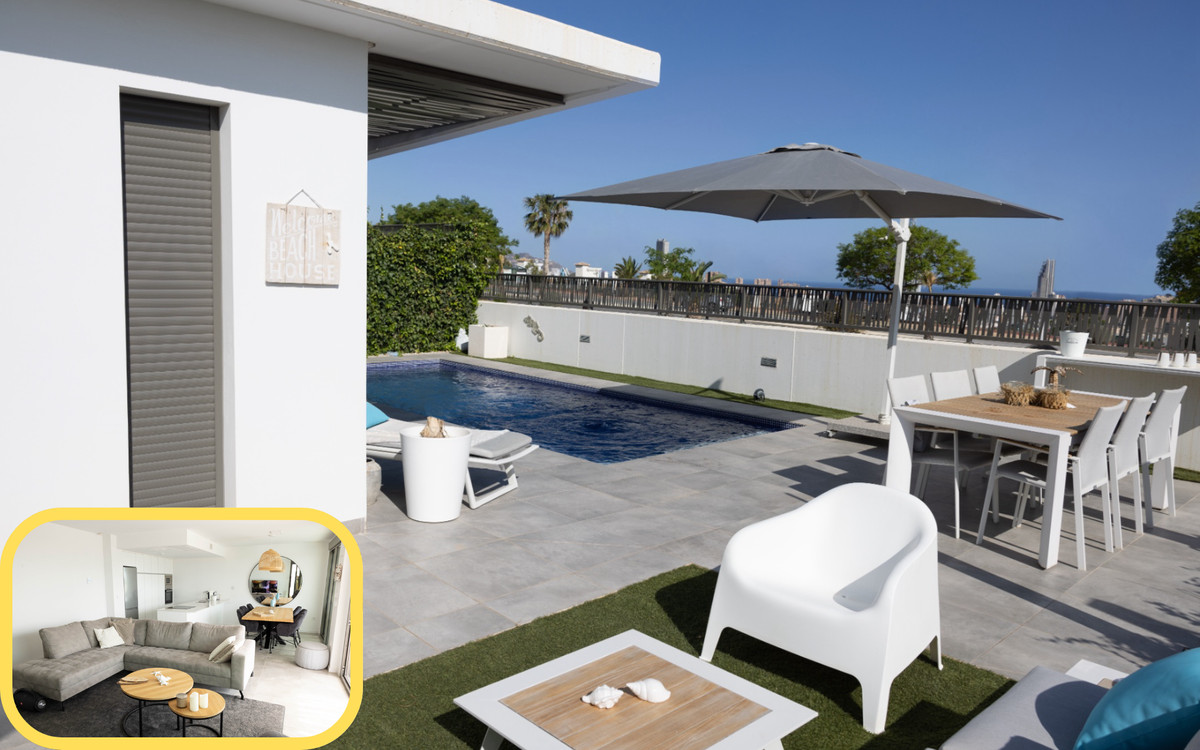 This beautiful villa, completed in 2020, is located in the popular Seascape urbanization in Finestrat. The Mediterranean-inspired building has two floors, a ground floor and a basement, both with direct access to the outdoor areas. The layout has been carefully designed to maximize natural light and create a bright and inviting atmosphere. Ground floor: style and comfort meet here On the ground floor there is a spacious 40 m² open plan living and dining room and a modern kitchen, all perfectly connected to the private pool and garden terrace. There are also three bedrooms and two bathrooms on this floor, with the master bedroom en-suite. Semi-basement: extra space, unlimited possibilities The 100 m² basement room offers many possibilities and includes: Large bedroom with bathroom and wardrobe. A versatile living room that can be transformed into a home cinema, gym or games room. The finished space is perfect for arranging a kitchenette or storage. From here you enter the tranquil 33 m² garden, a quiet, private haven. Key features Designed with comfort and convenience in mind, this villa offers: Air conditioning (hot and cold) on both floors. Electric blinds in the living room and bedroom. Manual blinds in other bedrooms. High-quality kitchen equipment from Balay. Energy efficiency class: A. Outdoor life at its best The outdoor areas are perfect for enjoying the Mediterranean style, with a large terrace (22 m² covered) and a private pool where you can relax and unwind. The property also has its own private parking space and additional public parking spaces are available in the urbanization area. Resort-style amenities Living at Seascape means you have access to great community amenities including: Several communal pools provide refreshment on sunny days. Fully equipped gym for fitness enthusiasts. Playgrounds where children can have fun. For added luxury, there is a paddle tennis court and hot tub. A secure environment with private security for complete peace of mind. It's more than just a home, it's a lifestyle. Whether you are looking for your dream home or a solid investment, this Seascape villa has it all. Don't miss this opportunity!