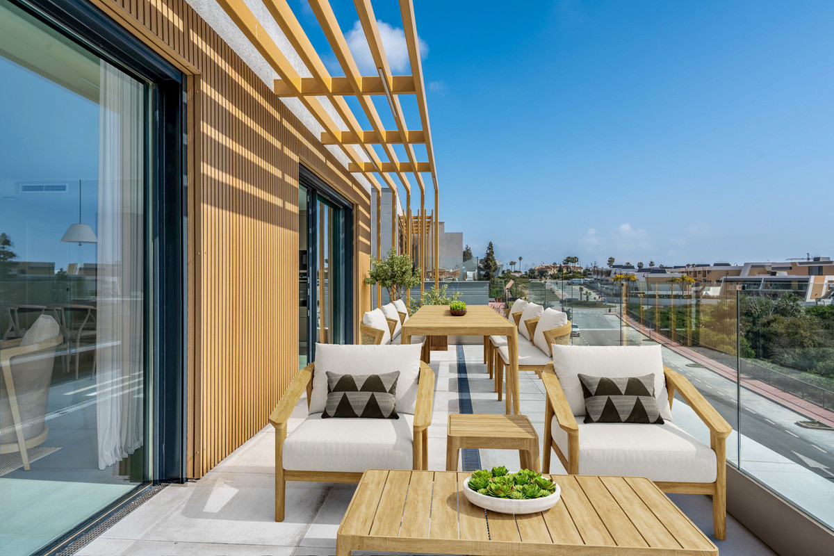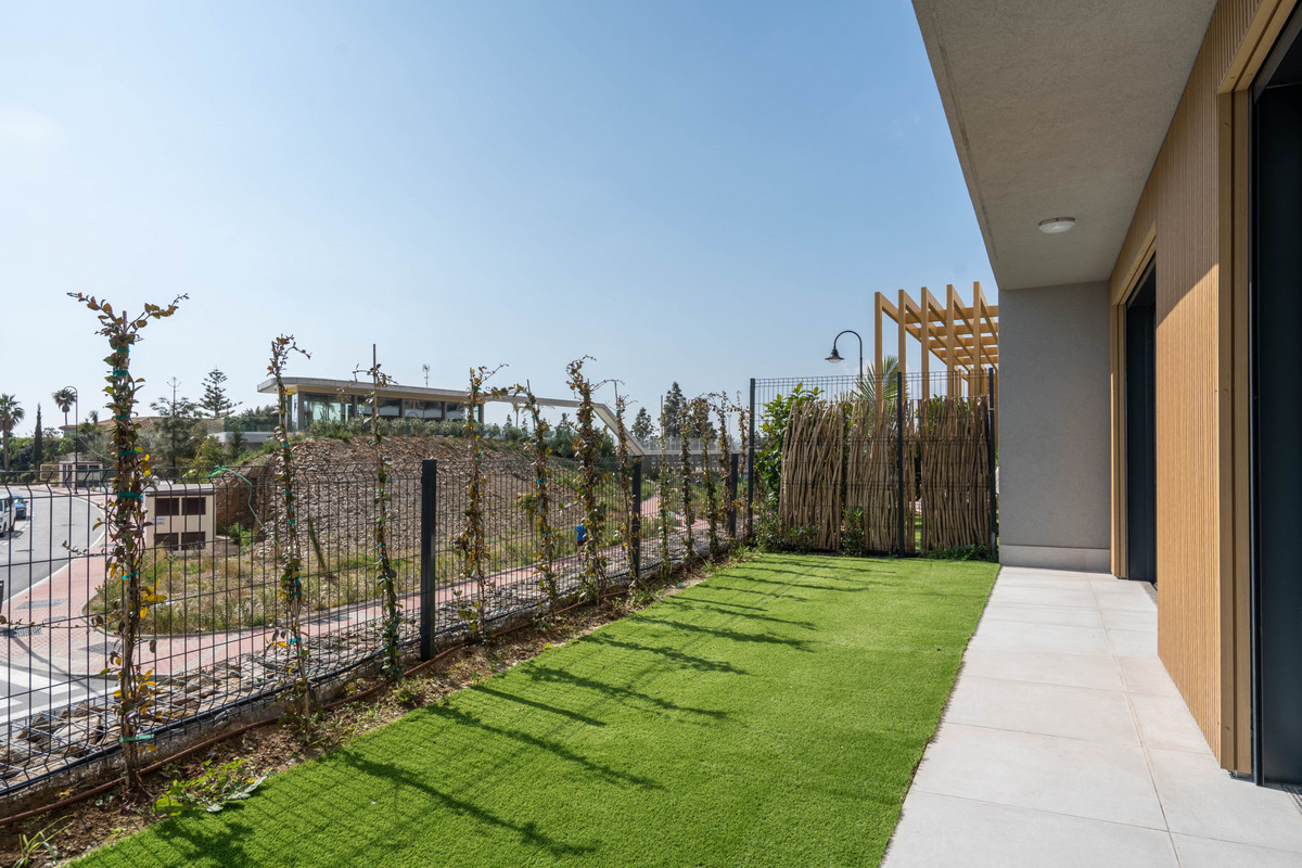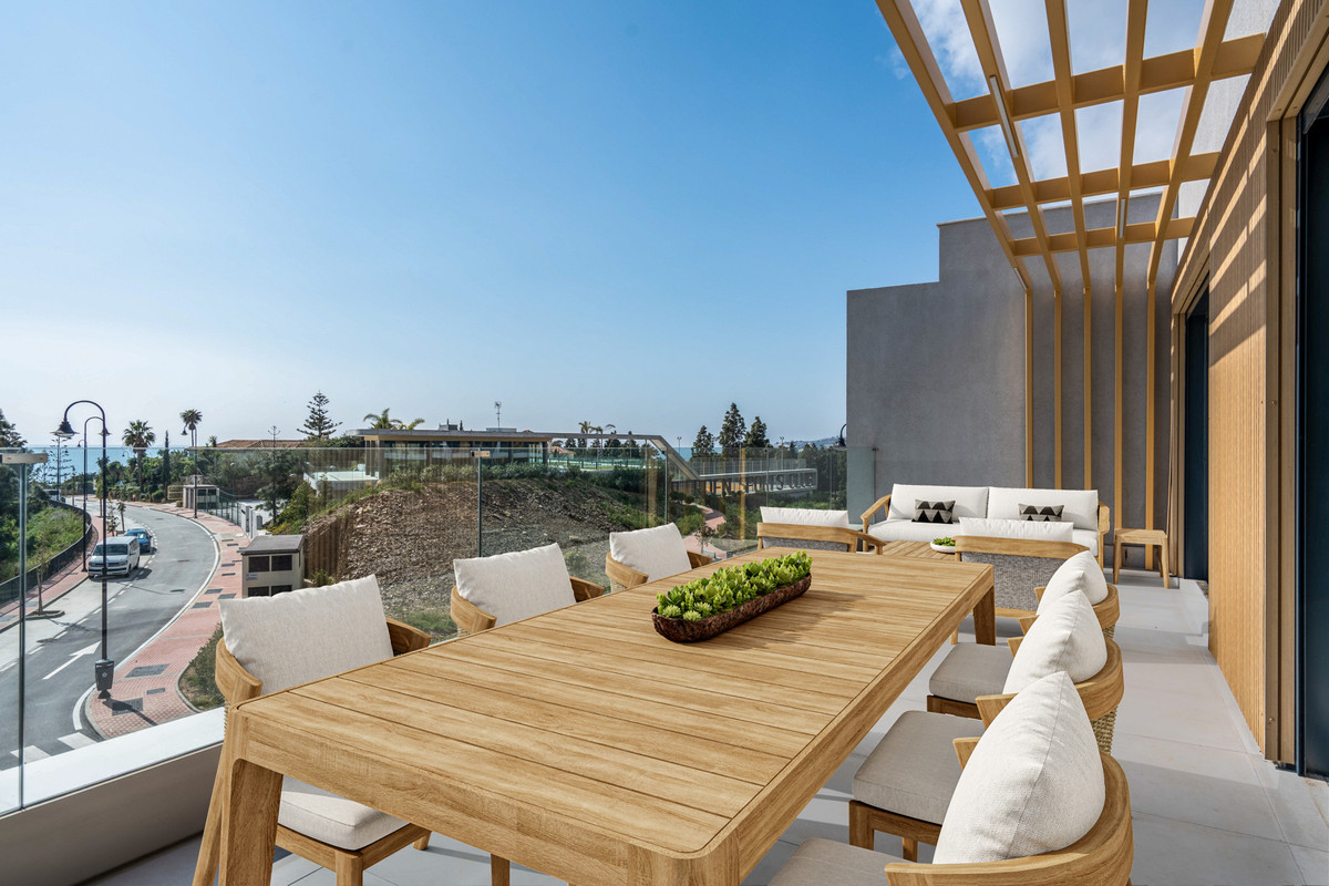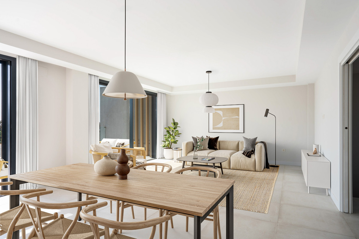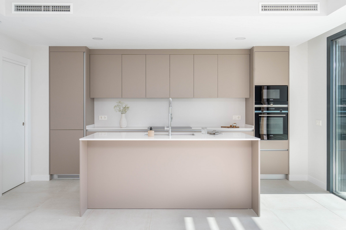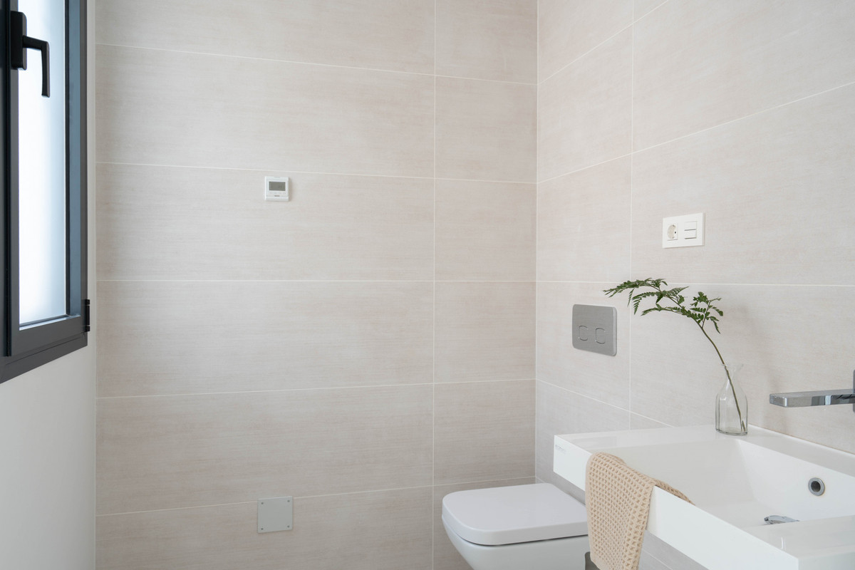 Detta hem har designats för att balansera stil och komfort. De öppna gemensamma ytorna och de rymliga interiörerna är skapade för att fylla rummet med naturligt ljus och ge en otroligt inbjudande boendeupplevelse. Den stora vardagsrummet har stora fönster och högkvalitativa porslinsplattor, vilket skapar en ljus och luftig miljö som maximerar dagsljuset under hela dagen. Den rymliga terrassen erbjuder panoramautsikt över havet—en idealisk plats att koppla av och njuta av fantastiska solnedgångar. Köket flödar sömlöst in i vardagsrummet, vilket bidrar till den öppna och friska atmosfären som passar perfekt för avslappnat och bekvämt vardagsliv. Förstklassiga materialval, inklusive kvartsbänkskivor, inbyggda apparater och ambient LED-belysning, höjer ytterligare rummet och ger en känsla av sofistikering och värme. I badrummen ger stora porslinsplattor elegans och understryker den noggrannhet och kvalitet som präglar designen.