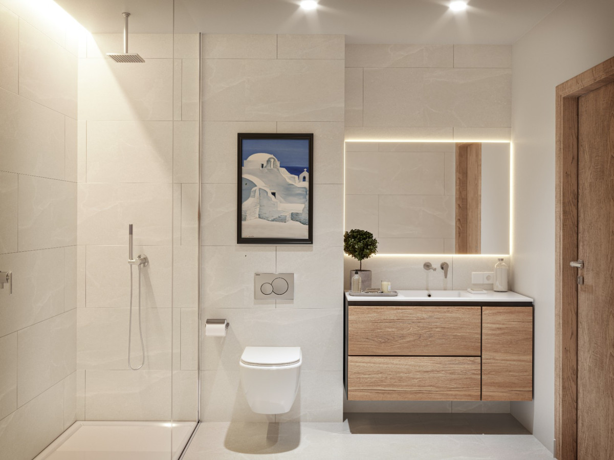 Köket är möblerat och utrustat med toppmoderna apparater, inklusive ugn, induktionshäll och fläkt. Badrummen har vägghängda träskåp, en jämn duschbricka och inbyggda kranar.