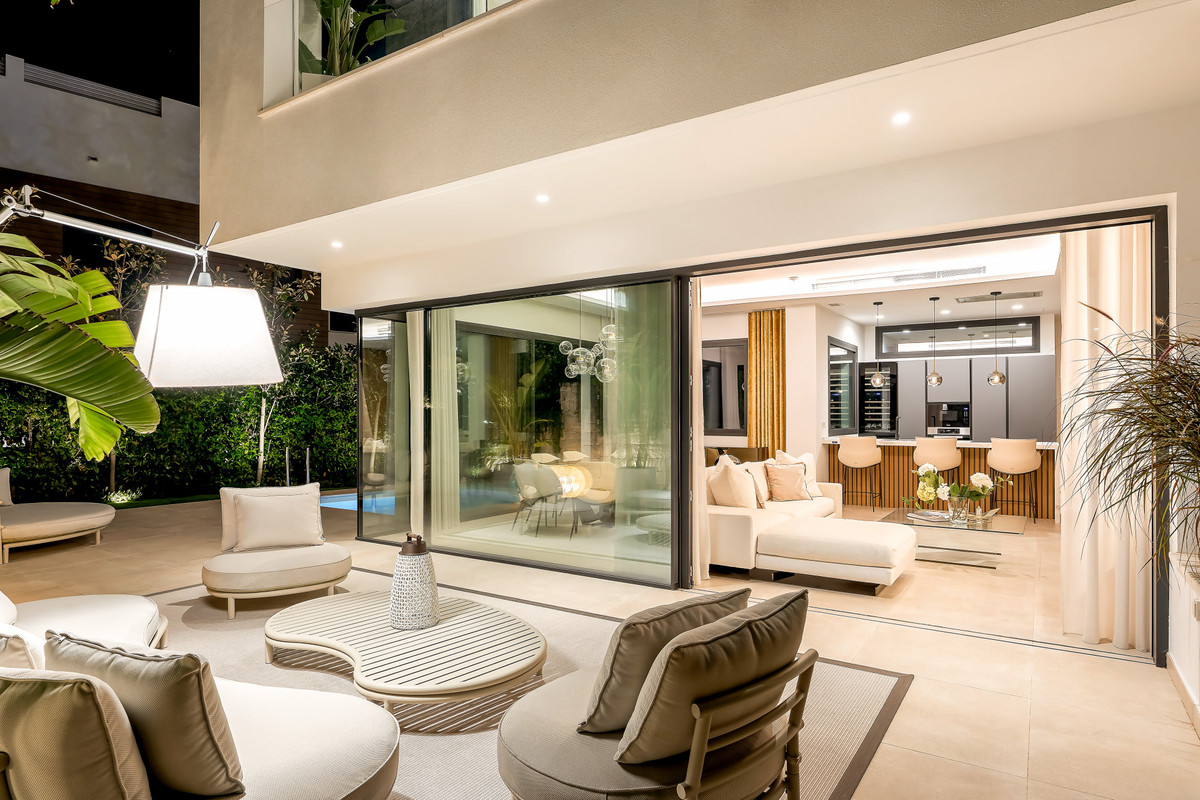 Only the finest materials have been used, including Porcelanosa tile flooring inside and out, triple-glazed Cortizo windows, Porcelanosa bathroom fittings, oak carpentry, and ambient lighting throughout. Comfort and convenience are guaranteed with underfloor heating across the entire home, zoned air conditioning, a domotics system for lighting and climate, and a built-in cinema-grade sound system.