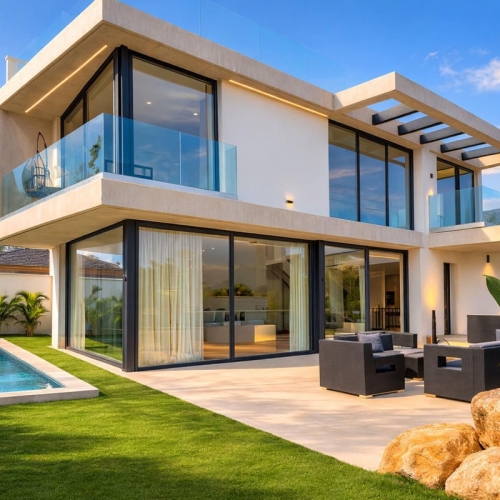 This absolutely beautiful villa has just been completely reformed in a modern contemporary style and is situated in Nueva Andalucia, just a short walk from services and restaurants, including a supermarket. The large commercial centre of Central Plazas is just a 10 minute walk away. The villa is in a no-through road, guaranteeing a peaceful and private location, free of traffic. The villa itself is very impressive and the materials used in the refurbishment are top quality. Upon entering on the villa we find a spacious open plan configuration, with large windows that allow plenty of natural light into the property. This area incorporates the kitchen, with island and completely fitted out with quality appliances including a wine fridge, the dining area and the living area with fireplace . There is also a breakfast area and several terraces to enjoy the ambient climate. The laundry room and storage are in a separate area. On the upper level we find three bedrooms, all with modern ensuite bathrooms and two of the bedrooms have a nice terrace. On the lower level of the property, we find two more bedrooms, two bathrooms, a TV / Cinema room and a games room with pool table / table tennis table. There is also an office on this level. Several features have been incorporated into the design such as a Demotic system that controls the lighting, heating, cooling, electric blinds and the security. Everything can be controlled via a mobile smartphone. The villa has good security with CCTV cameras both inside and outside the villa and these cameras can also be accessed from a smartphone. The landscaped gardens offer beautiful and open views of La Concha mountain and the villa also offers total privacy. Everything comes with a year guarantee, giving the new owner absolute confidence in this beautiful new home.
